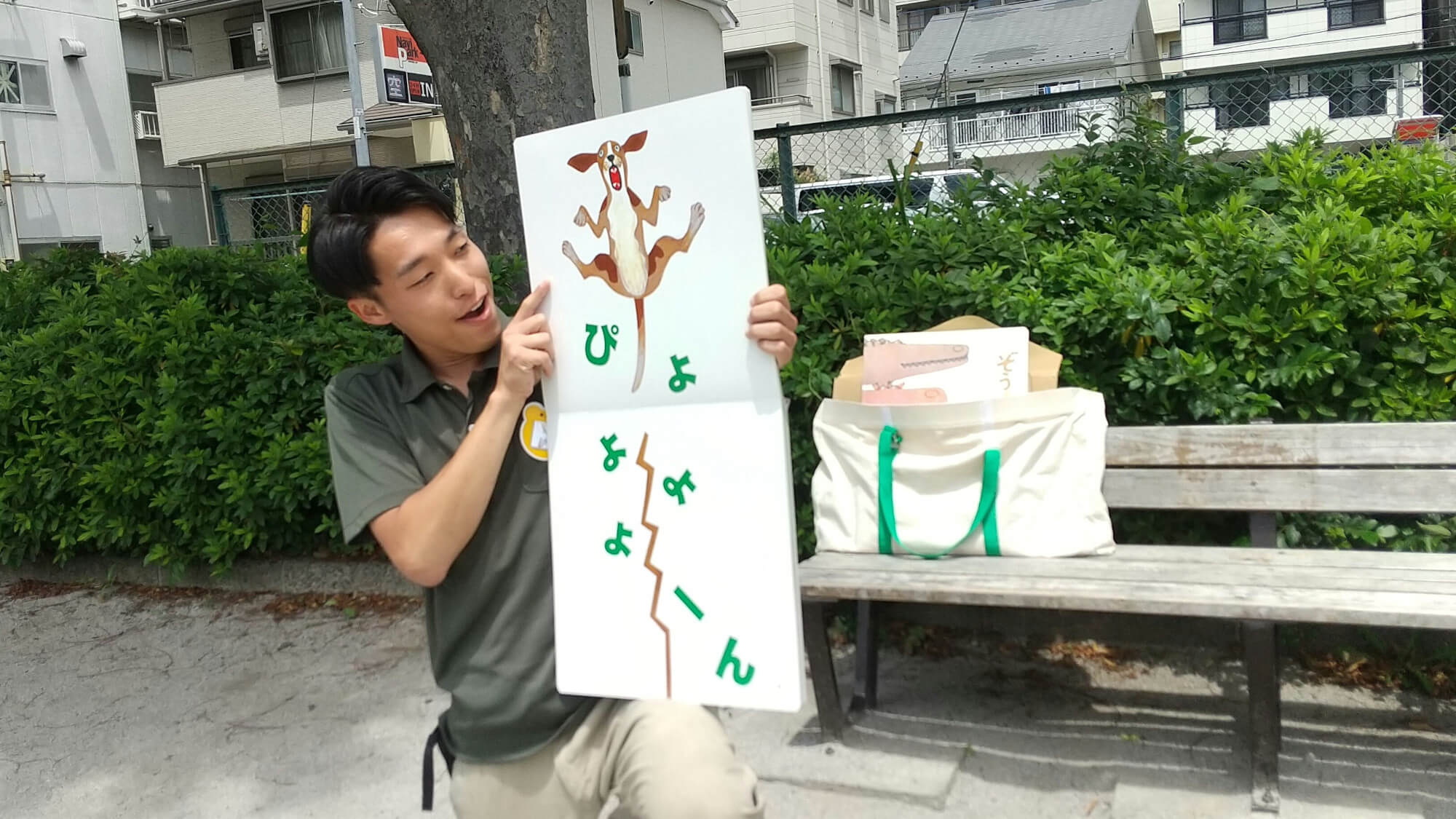 6月は、『ぴょーん』いうタイトルの大型絵本を読みました。スタッフが絵本をめくるたびに、様々な生き物がピョーンとジャンプします。