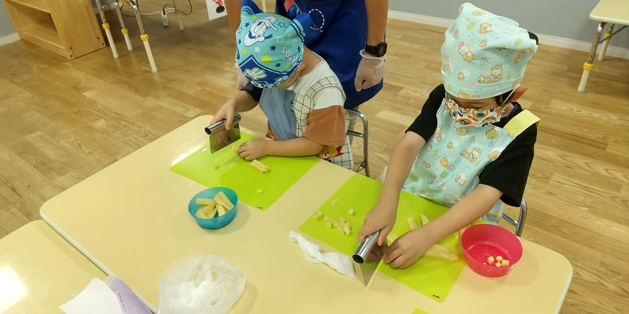 食育活動を積み重ね、スケッパー操作に慣れている年長児は、「2個一緒に切ったほうが早く終わるよね」と自ら考えて工夫する姿が見られました。