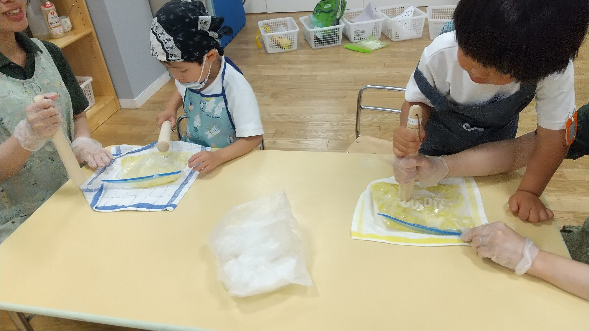 ジャガイモがまとまってきたら、成形です。見本は丸い形でしたが子どもたちの発想力は無限大!魚や蛇、リボンなど好きな形にしていきます。