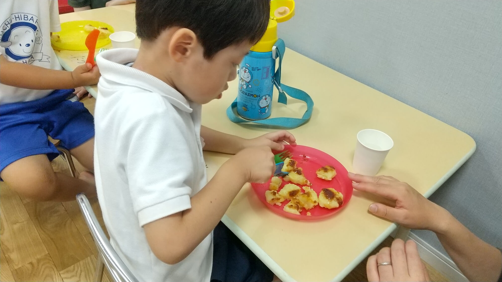 「お家でも作ろうね」と調理の工程を保護者に説明したり、普段ジャガイモを食べない子どもも一口食べようと挑戦したり、保護者から「美味しいよ」と褒められると照れくさそうに笑ったりする姿がありました。