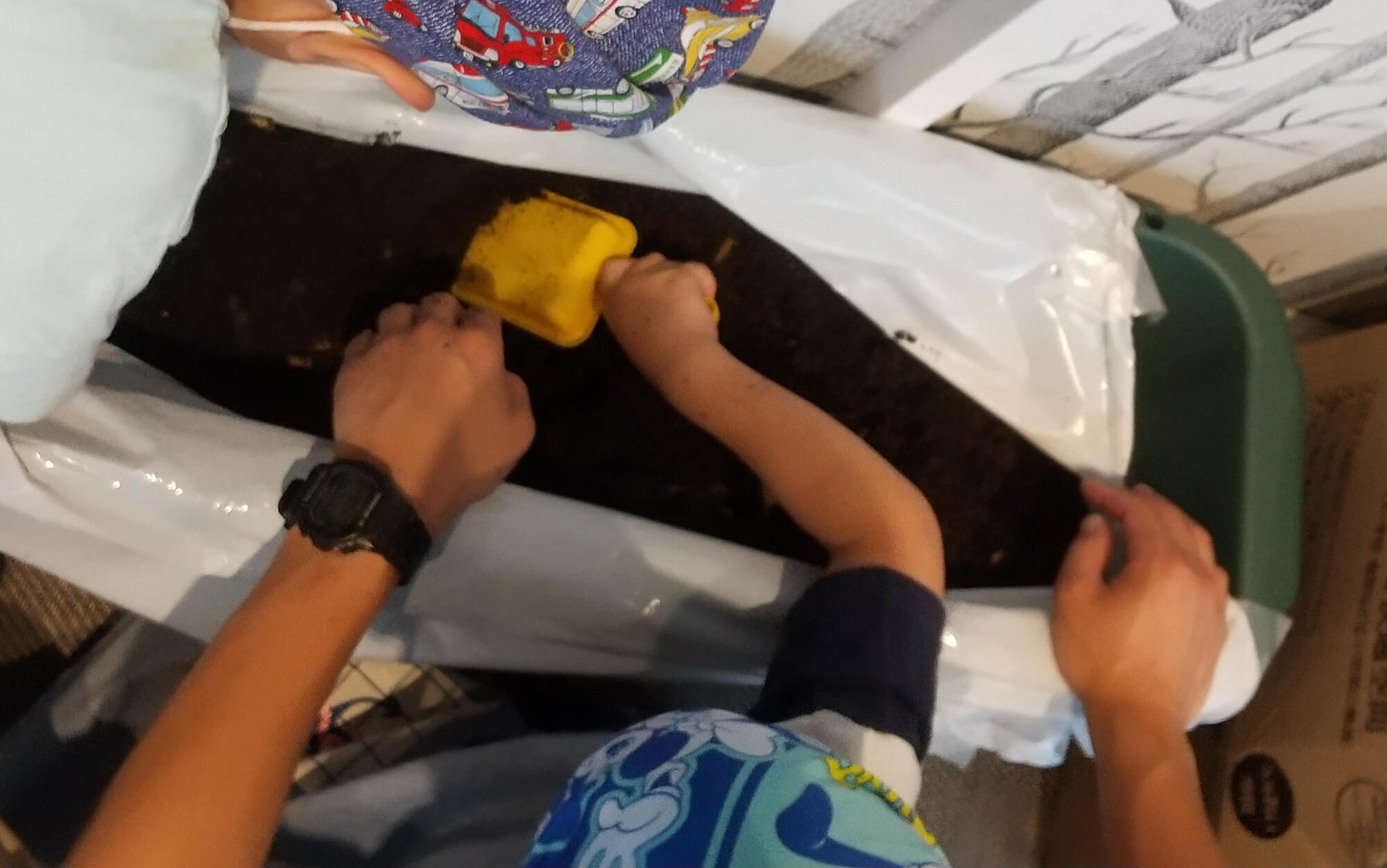 「栄養たっぷりの土を作ってまた美味しい野菜を作ろうね」とジャガイモの皮や食べきれなかった残食は自分たちでコンポストに入れます。野菜の皮や残食がなくなり土になった様子を見て疑問に思ったり、面白いなと興味を持つことで、食品ロスなどの環境問題についても考えるきっかけになったら嬉しいです。