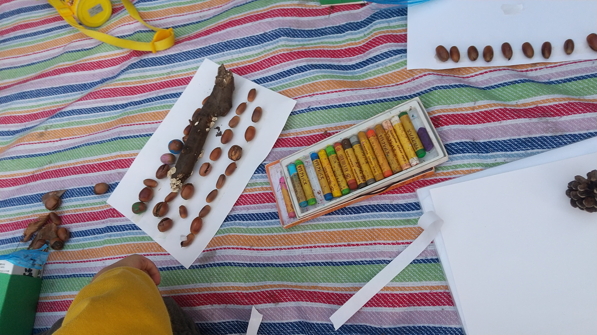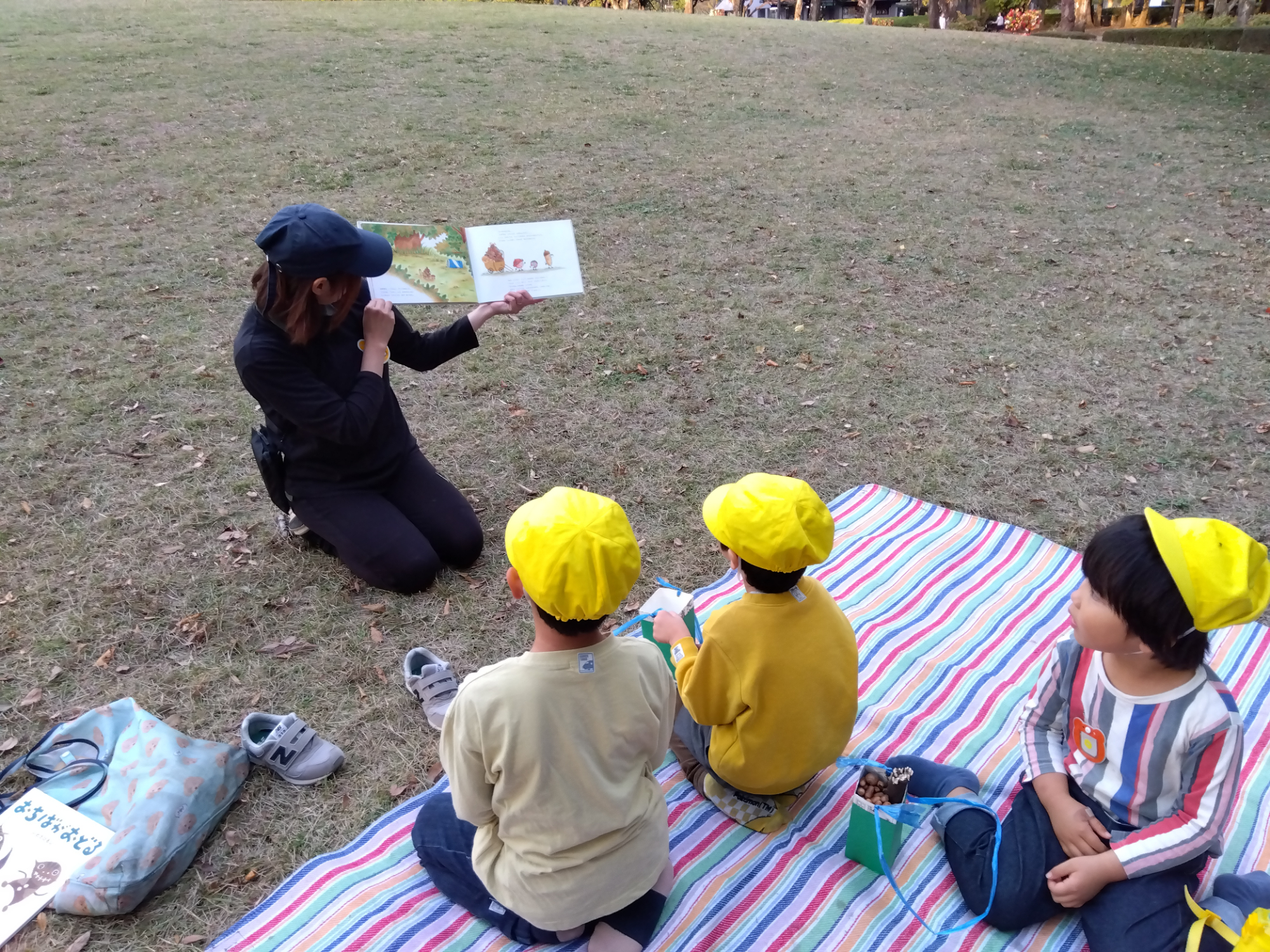 「秋 といえば?」と、子どもたちに聞いてみたところ、「落ち葉!」「どんぐり!」「松ぼっくり!」など、いろいろな意見が出てきました。そこで、「秋の落とし物を探しに行こう」と提案し、都立府中の森公園(府中市浅間町1丁目3-1)や、すずかけ公園(府中市日鋼町1-1-23)、美好町公園(府中市美好町1丁目27)など様々な公園に散歩に出かけました。散歩バッグを持ち、道中や公園で落ち葉やドングリ、木の実などを拾って歩きました。