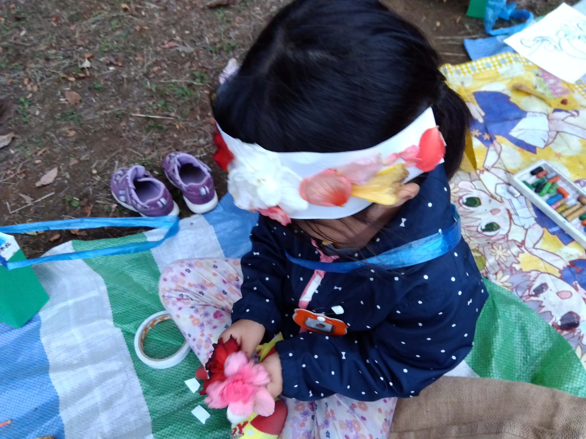 集めた落ち葉やドングリ、落ちていた花などを使って公園先で制作開始です。両面テープを手渡すと、画用紙に貼り付けて、それぞれが思い思いに、好きな素材を貼っていきます。花をたくさんつけて花冠にする子もいれば、画用紙いっぱいにびっしりとドングリを貼り付ける子もいました。