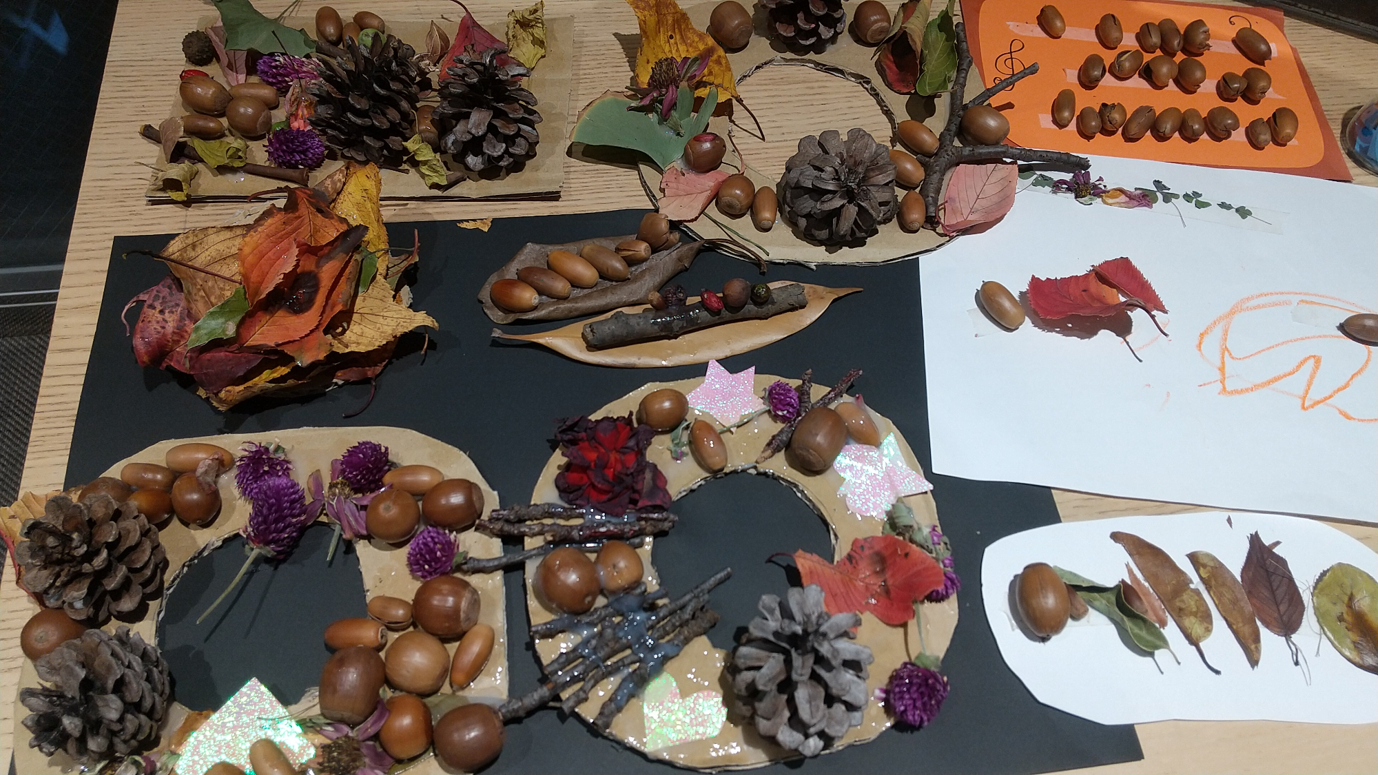 また、拾ったドングリや葉っぱをつむぎに持ち帰り、クリスマスリースを作る子、葉っぱのケーキを作る子、虫の家や楽譜を作る子など、子どもたちは自由な発想で表現する姿が見られました。つむぎ 府中ルームの作品コーナーは、秋の落とし物の作品で賑わっています。