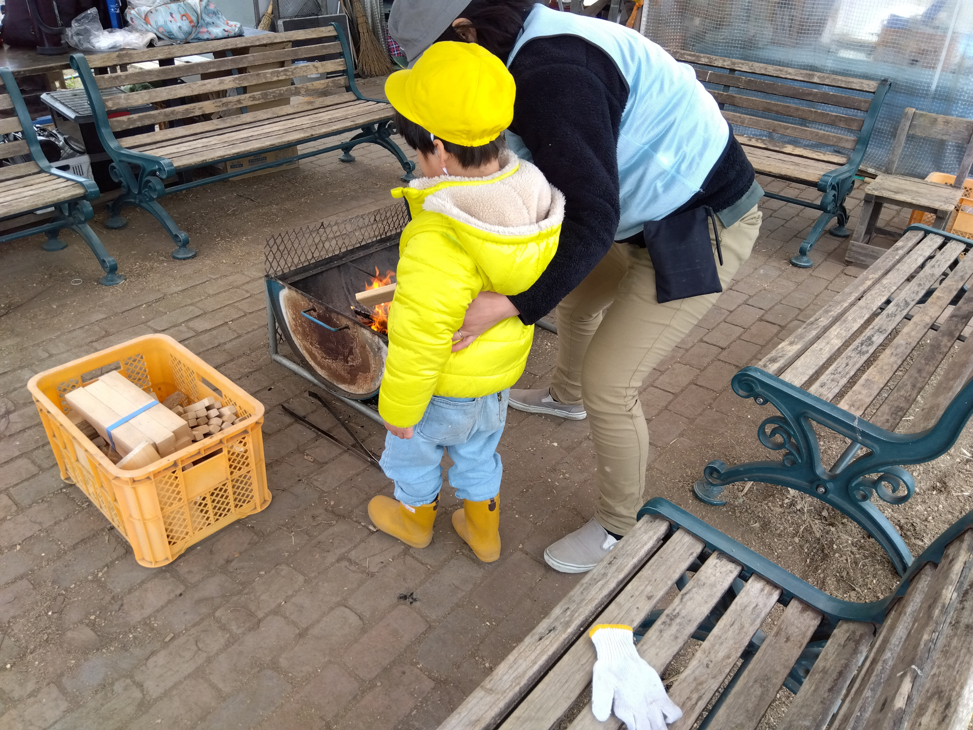 「すごい!」「うわ!くさい!」「パチパチ音がするね」と手拍子して焚き火の音を表現する子もいました。年長児が軍手をしてトングで大きな枝や薪を焚き火に入れていく様子を横目で見ていた年中のTくん。スタッフが「Tくんもやってみようか」と声をかけると「やってみる!」と元気な返事がありました。でも、実際やってみると「熱いよ」「怖い」とドキドキした様子だったので、スタッフが身体を支えながら一緒に行いました。