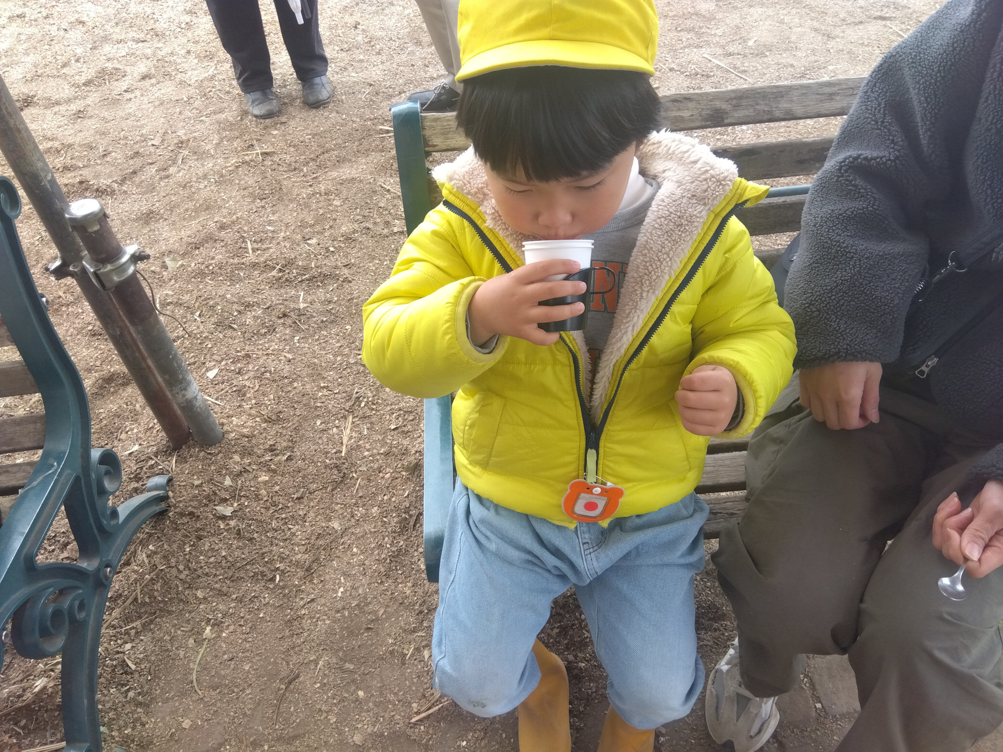 お湯が沸き、年長児が年下の子どもたちに熱いココアをゆっくりと運んで配りました。「ふーふー」と息を吹きかけて少し冷ましてから飲んでみると、「おいしい!」みんな満面の笑みでした。