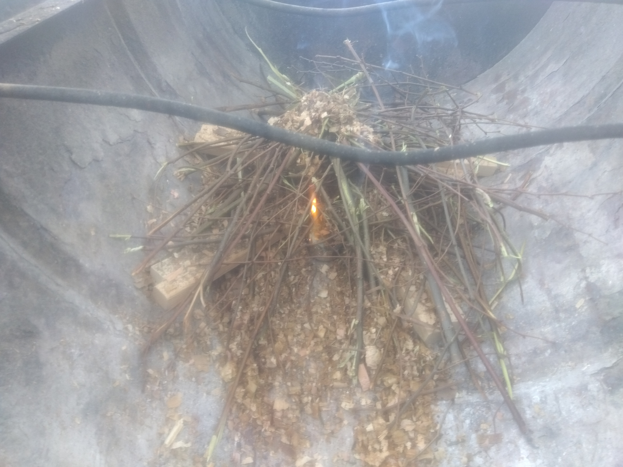 まずは火おこしです。年長児が主体となり、焚き火台に枝を三角の家になるように組み立てることから始まりました。保護者も加わり、枝の折り方や重ね方の見本を見せると、子どもたちは上手に真似をしてバランス良く枝を重ねていきます。そして一掴みのおが屑を枝の中に振り落として火おこしの準備完了となりました。