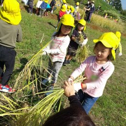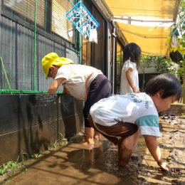 畑では、砂場や田んぼ(田植え前)で、「泥んこ遊び」をたっぷり楽しみました。中には汚れることや感触を嫌がる子もいますが、楽しそうに泥遊びをしている友達やスタッフの姿を見て、「さわってみようかな?」「足を入れてみようかな」と、挑戦する姿が多く見られました。