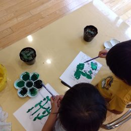 まず、ご紹介するのは、「絵の具を使った感触遊び」です。ペットボトルや紙コップ、粘土の道具などをスタンプにして、画用紙にペタペタと色をつけていきます。「これはどんな形になるかな?」「赤と青まぜたらどうなるんだろう?」子どもたちは色々なことを考えながら自由に製作していました。