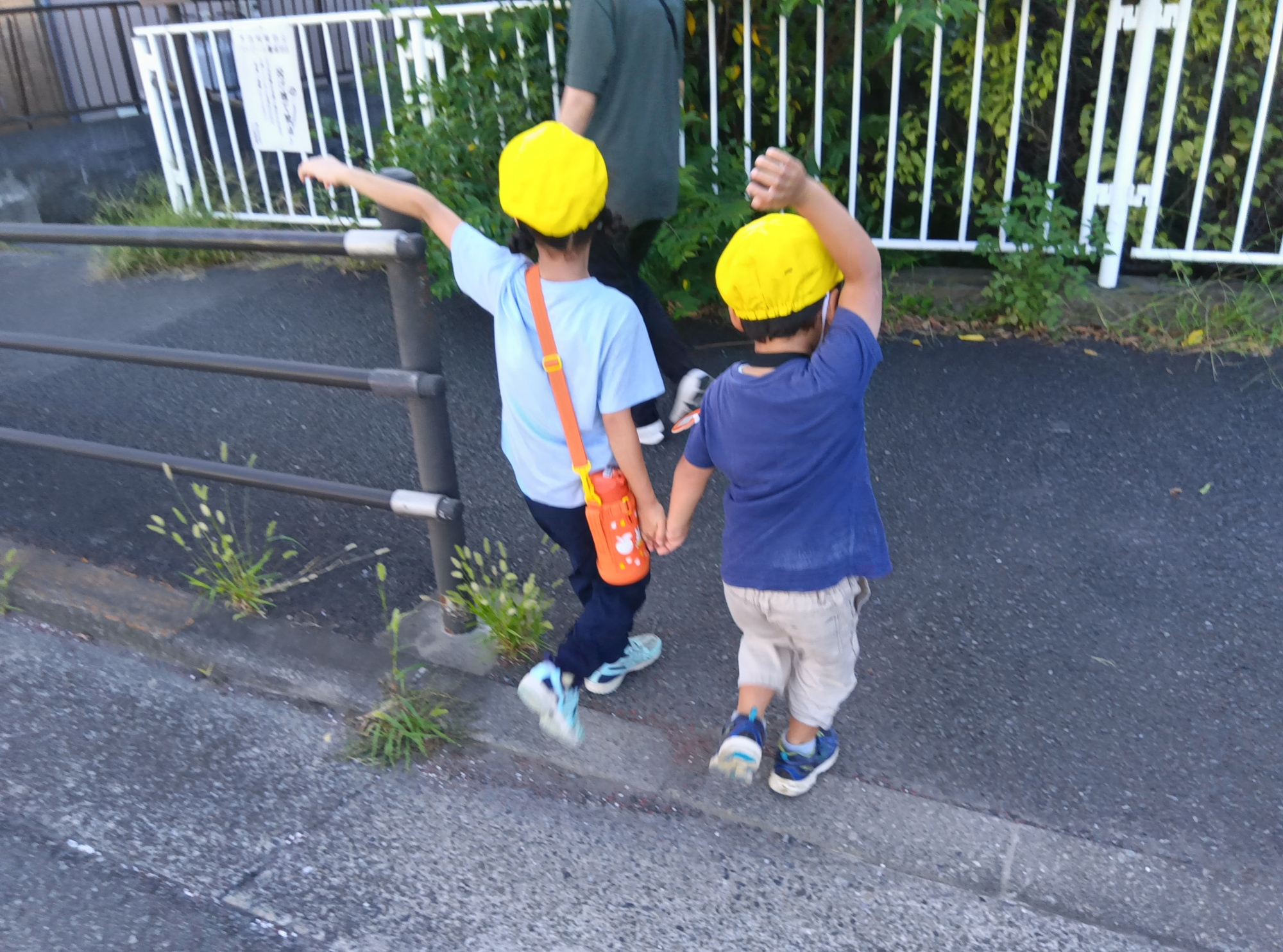 道路を歩く際は、友だちが手を上げて歩いているのを見て、真似をして歩くことができていました。「健康な心と体」に繋がる力です。