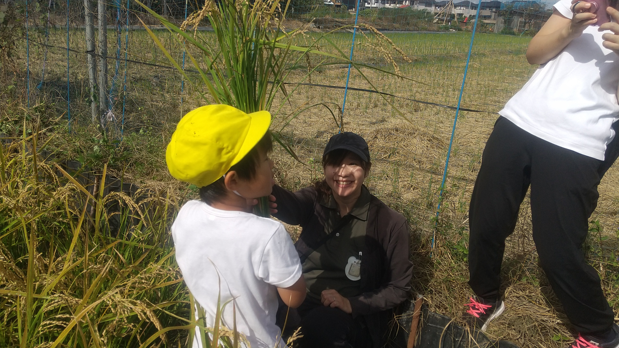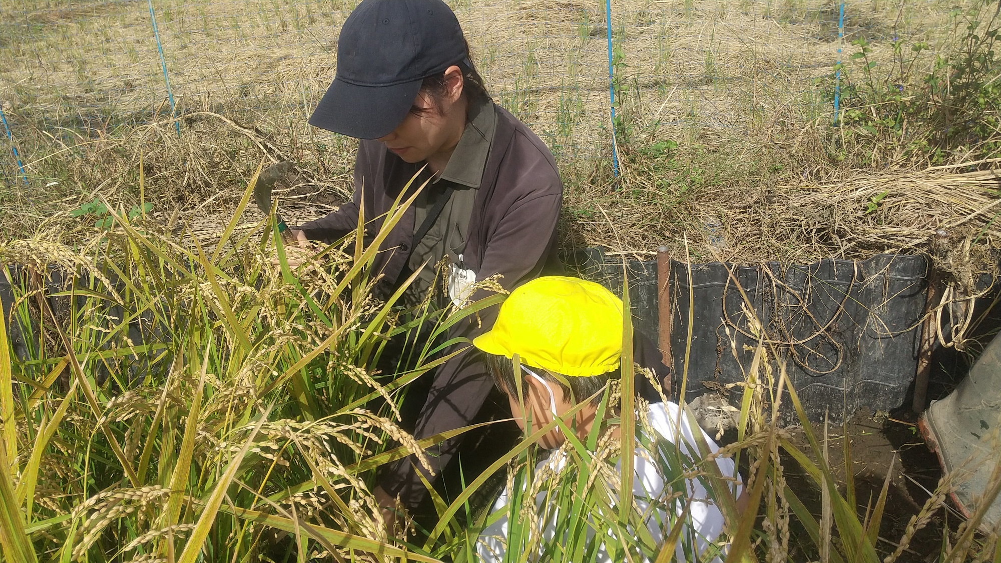秋も深まり、木々が色づき始める季節なりました。今回は、10月中旬に畑の敷地内にある田んぼで行った、稲刈り体験の様子をお伝えします。