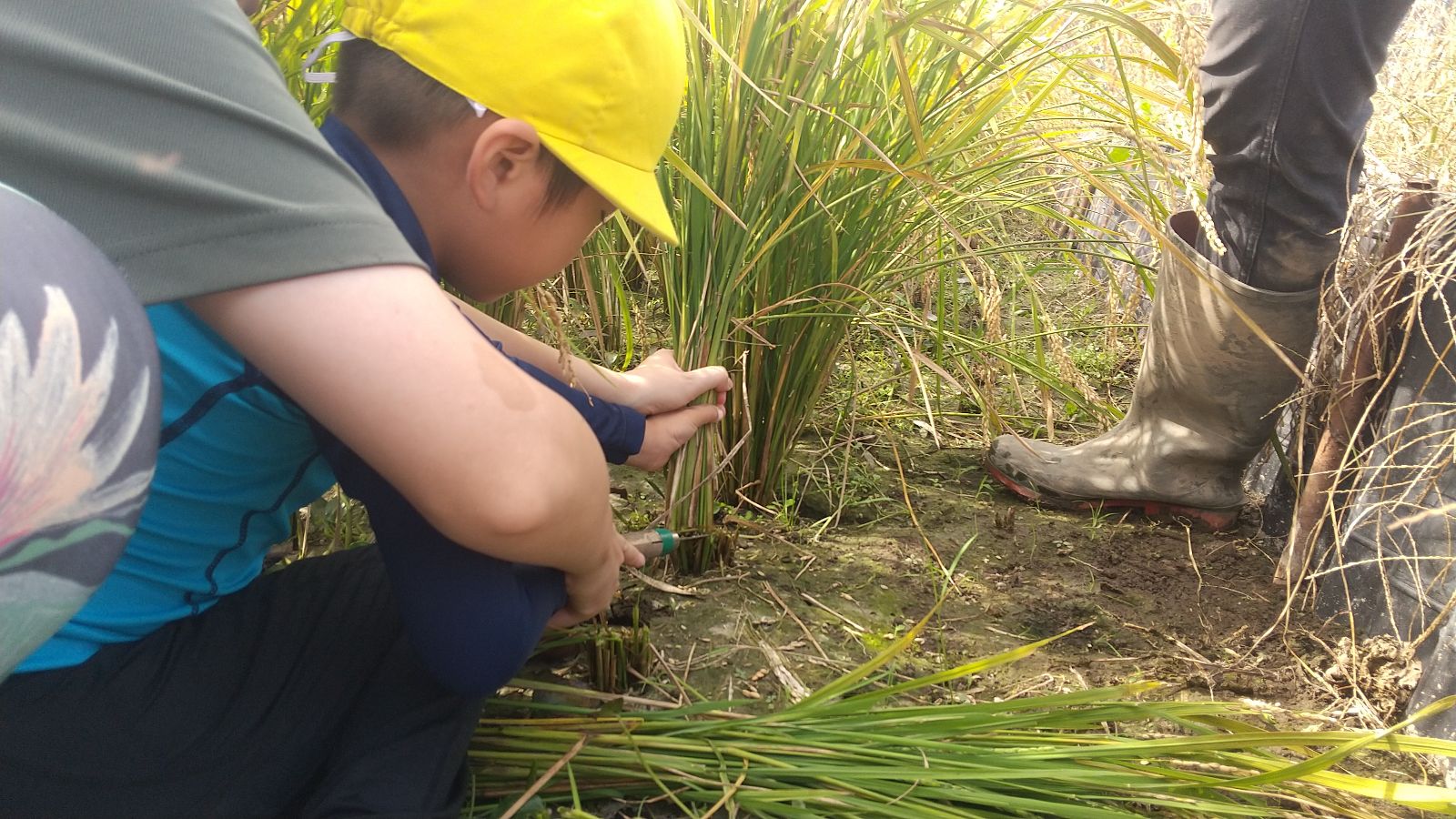 収穫した稲を見て、「どこにお米があるかわかる?」とスタッフが聞くと、考え込む子どもたち。スタッフが穂先を指して、「この茶色い粒の一つ一つにお米が入っているよ」と伝えると、「ほんとだ!お米と一緒の形だ!」と、気づきを得ていた様子でした。