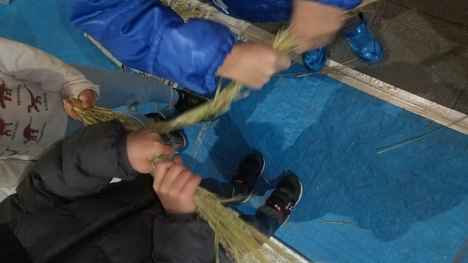 縄を綯う作業は、子どもにとって1人で行うことが難しいです。子どもたちは、それぞれの役割の中で他者の動きを意識しながら自分の動きを調整して行っていました。協同作業を通して「自分のしめ縄だけが完成できれば良い!」という気持ちではなく「みんなのしめ縄を作ろう!」という他者を思いやる気持ちを育むことができました。