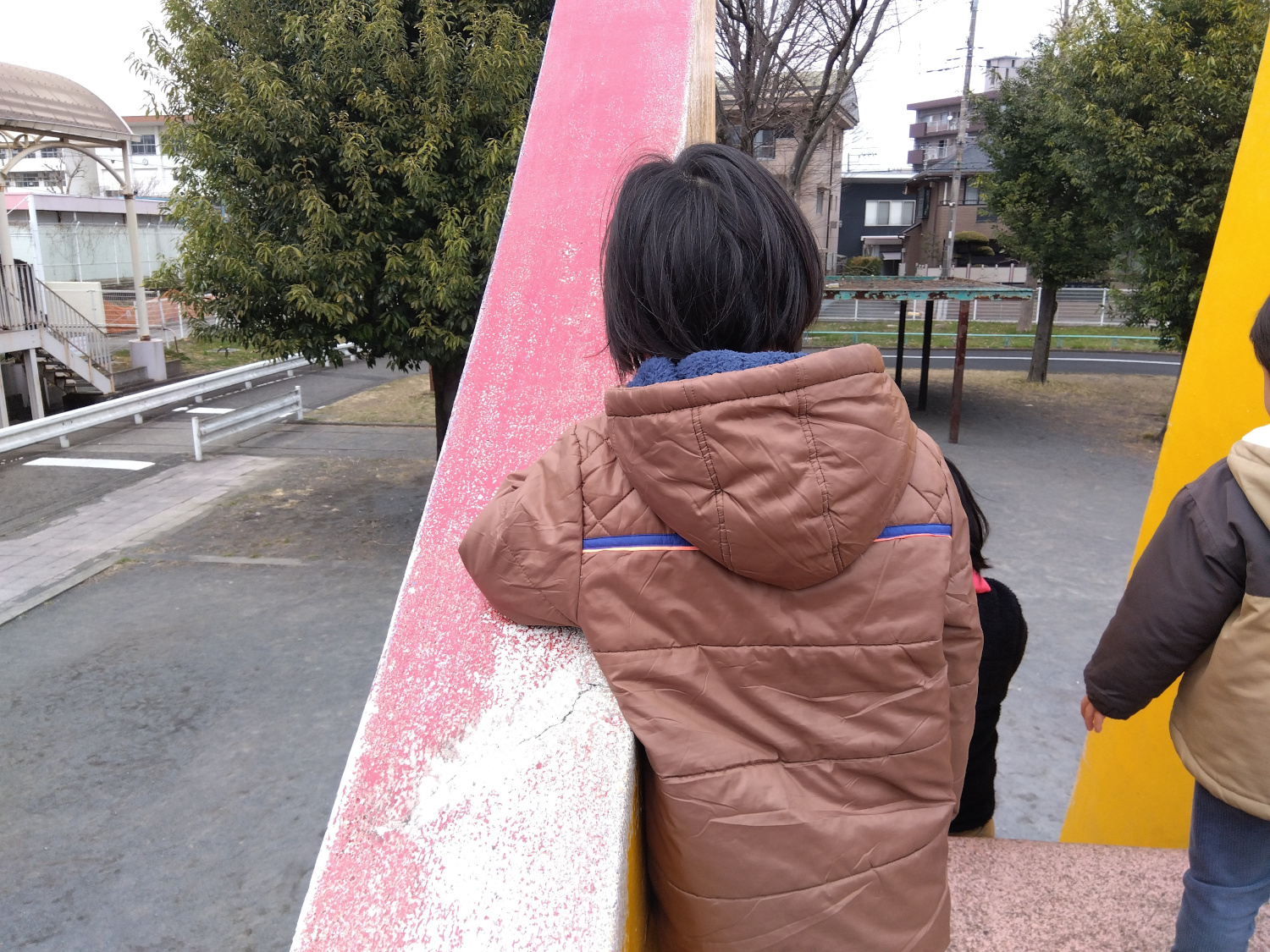 この日は、足漕ぎカートが使用できない日だったので、大型遊具で遊ぶことになりました。大きな滑り台を「楽しい!」と言って楽しむ友だちに対して、僕は、怖いからやらない」と話すKくんの姿がありました。