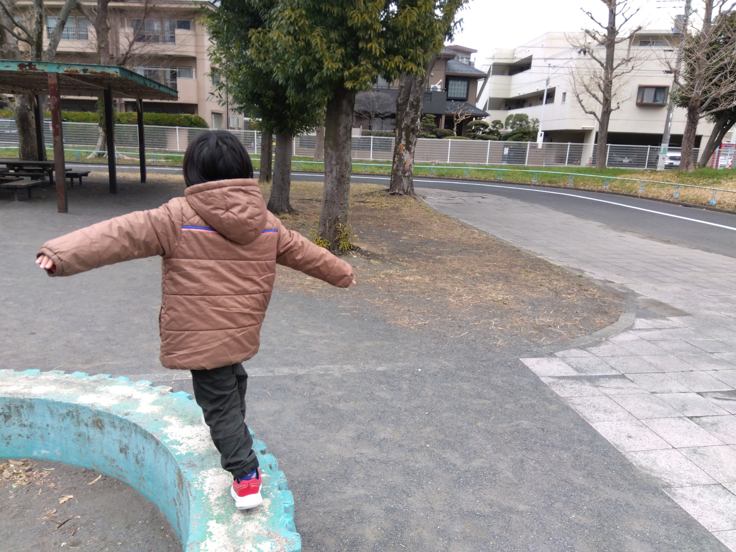 その後のK君は友だちが滑り台を楽しむ様子を見ながら、自分が出来る遊びで過ごします。石の台座に着地し、バランスをとりながら歯車の形をした平均台を進みました。