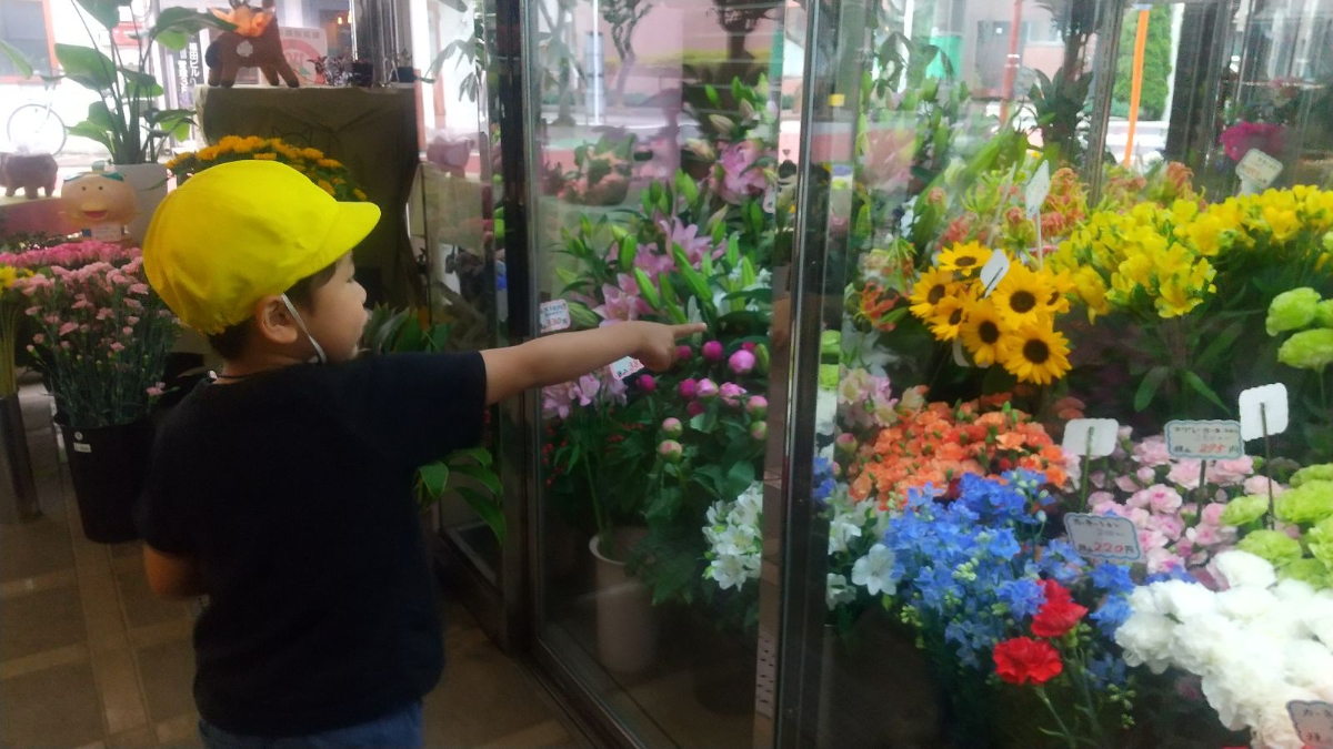 子どもたちの心の準備が出来たところで、挨拶をしながら店内に入っていきました。「おおー!」「きれい」「たくさん」「あ!黄色あった」と目を輝かせながらショーケースの花を見ていきました。