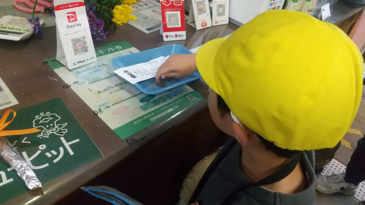支払のときには、花屋の店員さんが優しく「220円です」「100円3枚出してね」など教えてくれました。自分のお財布からお金を出したり、お釣り、レシートをもらったりと、たくさんやりとりをすることができました。店員さんの「ありがとうございます」という言葉に、自然と「ありがとう」と伝える姿も見られました。