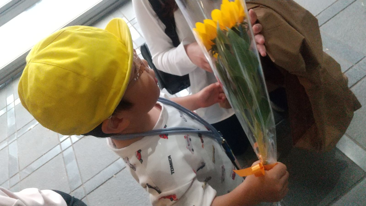 花を購入してつむぎ 府中ルームに戻ってきた子どもたち。「ママにあげる!」と張り切っていた子は、お母さんが見えると走って花束を渡しに行きました。お母さんが喜んでいる姿を見て、恥ずかしそうにしながら喜んでいる姿はとてもほほえましかったです。