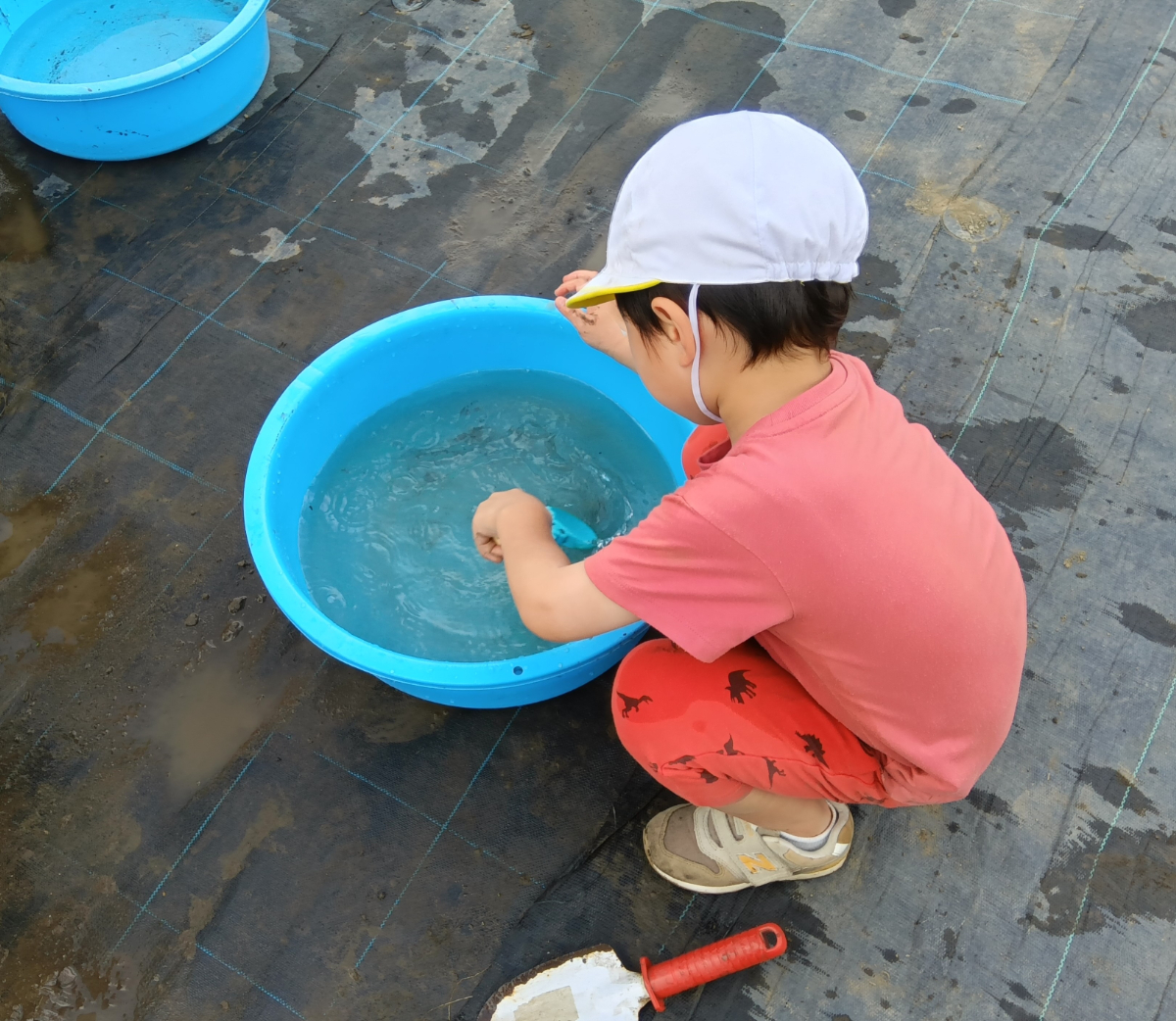 水の冷たさや泥のぬるぬるする感覚を全身で感じています。夏ならでは、の姿ですね。
