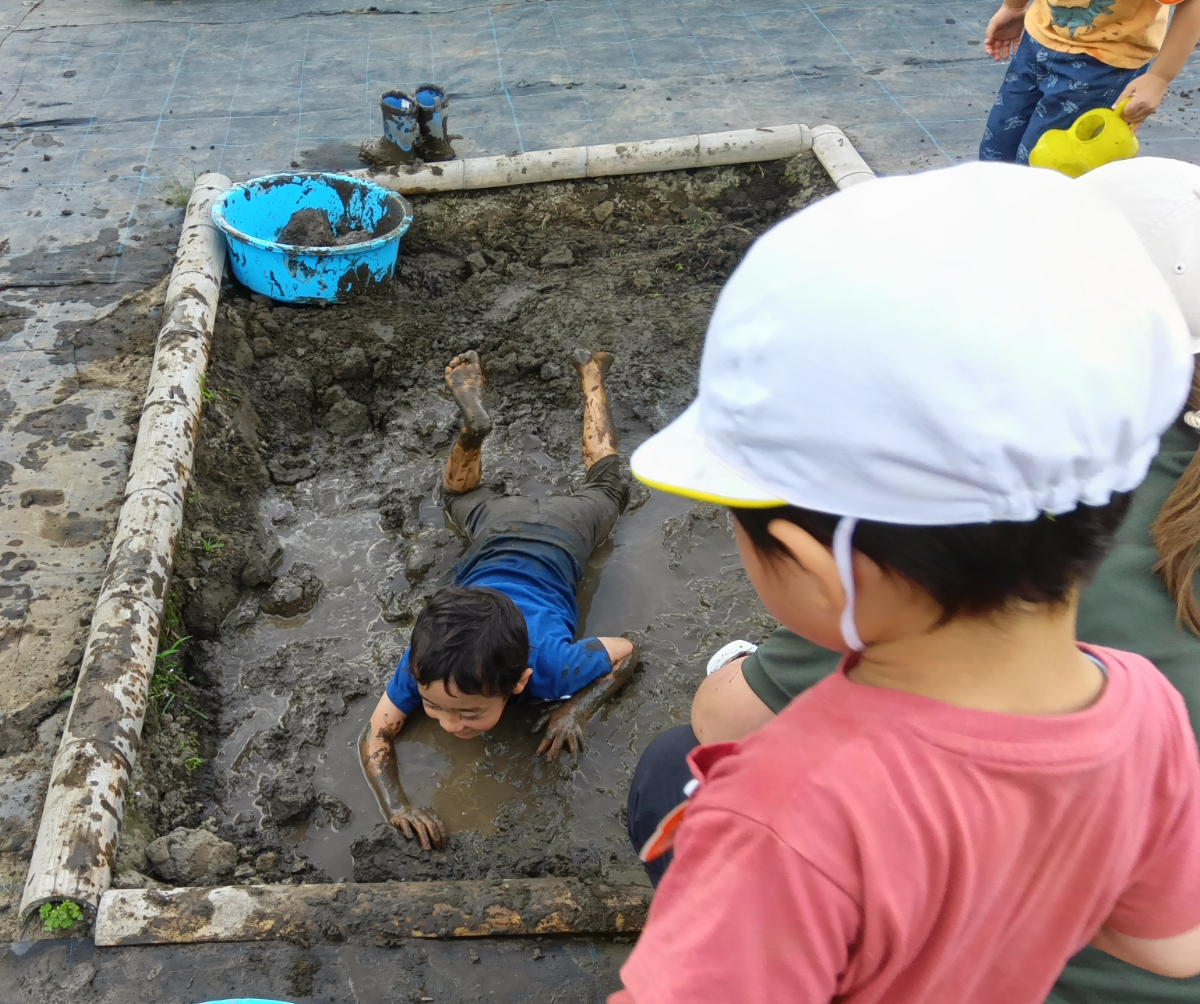 水遊びと泥遊びです。ダイナミックな動きで楽しそうに遊ぶ子どもたちです。