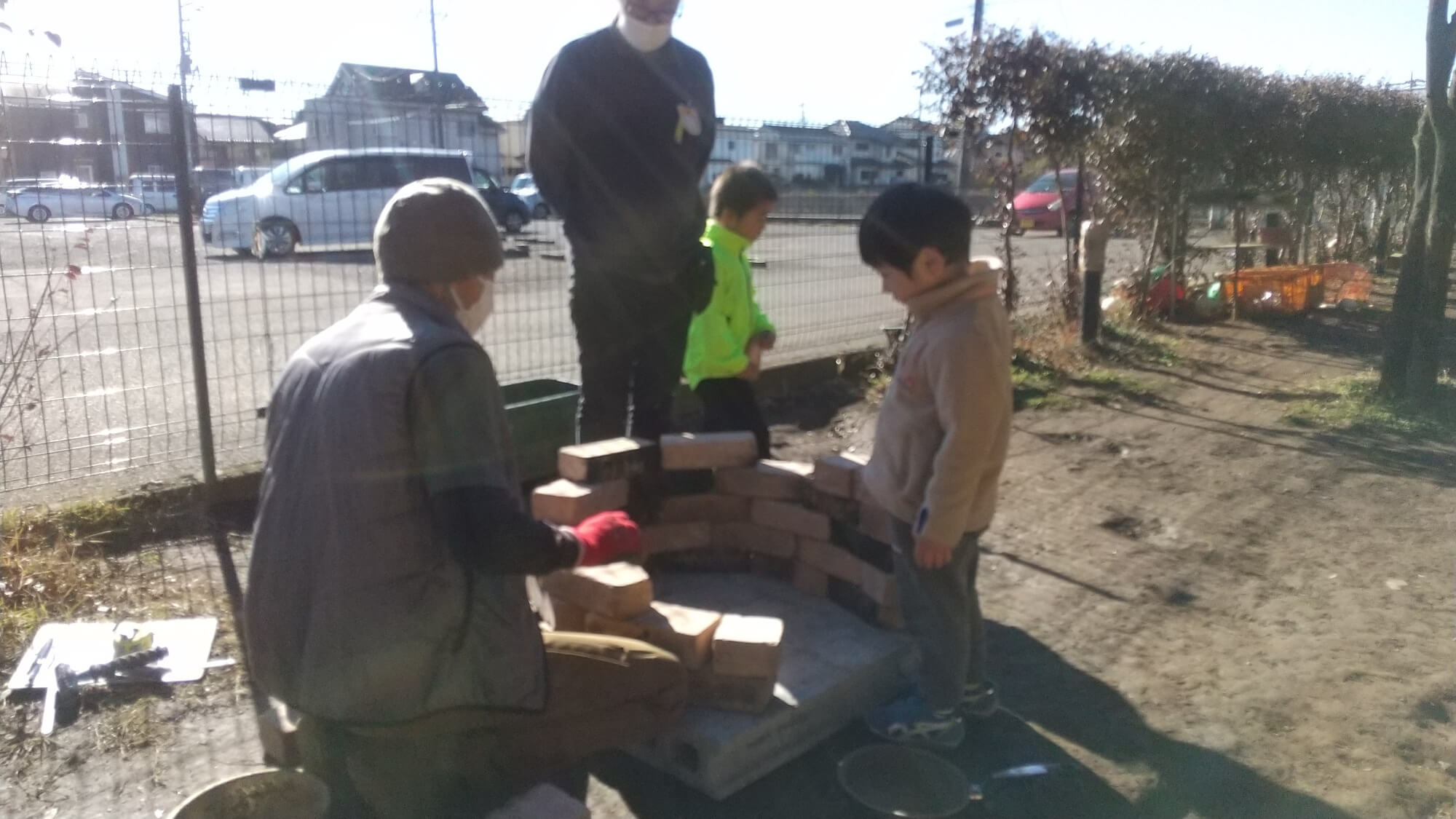 現在、発達支援つむぎ ふじみ野ルームでは、併設しているふじみ野どろんこ保育園と合同で「かまどを作ろうプロジェクト」が進んでいます。かまどを試作中のため、職員がブロックを組んでいると、近くに行き、じっとかまどを見つめたり、ブロックを触ってみたりと興味津々の子どもたち。