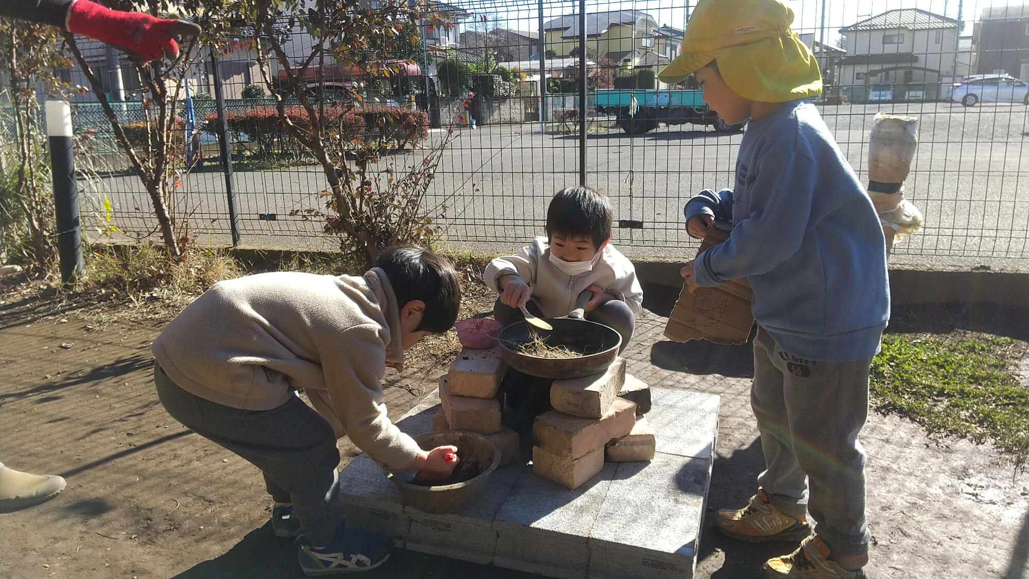 その後、試作をしていた用務員のSさんが、子どもたちがそのまま遊びを展開していけるようにと、かまどを小さくした形でブロックを組み直してくれました。そこからは、フライパンをもってきたり、葉っぱを拾って炒めてみたり、更に小枝を集めてかまどの中に入れたりと遊びが広がっていく様子が見られました。