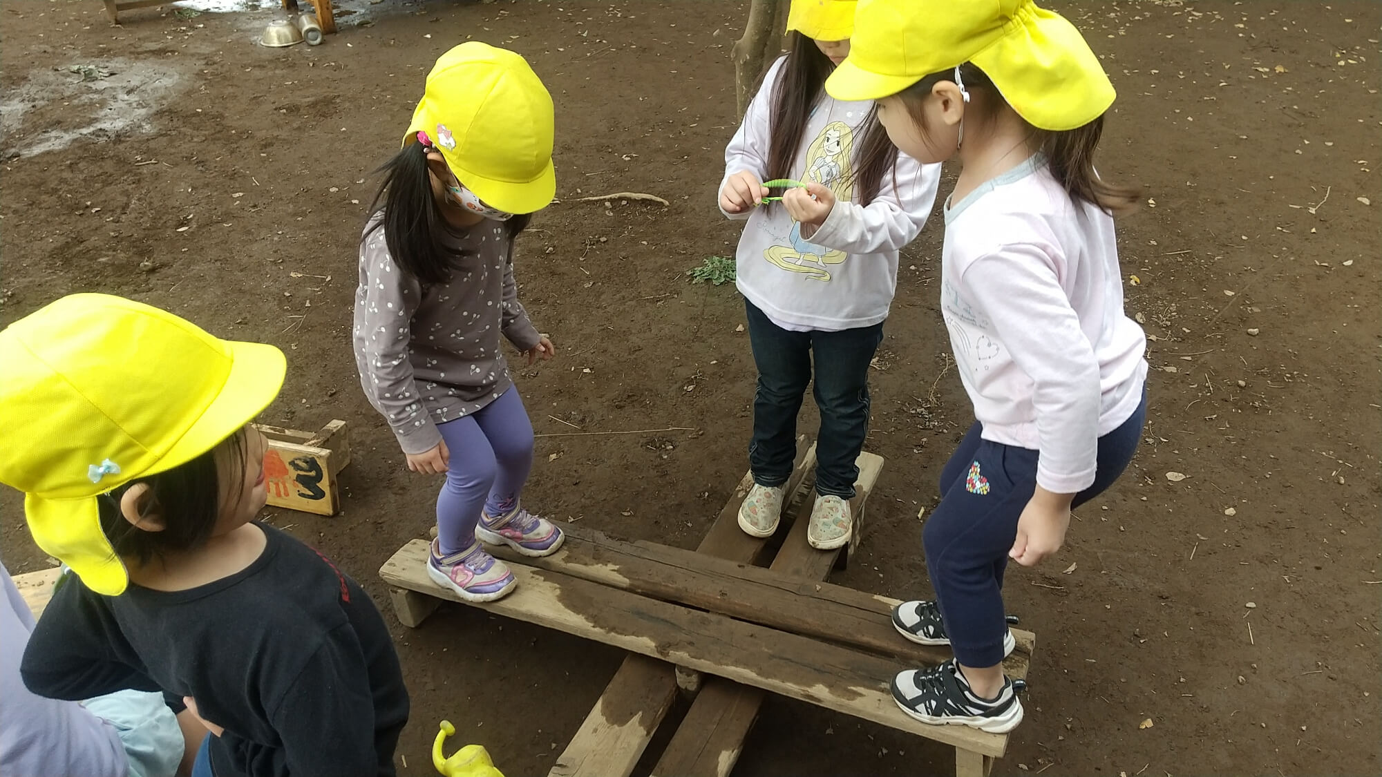 この写真では、二つのベンチをシーソーに見立てて組み合わせて遊ぶ姿が見られています。