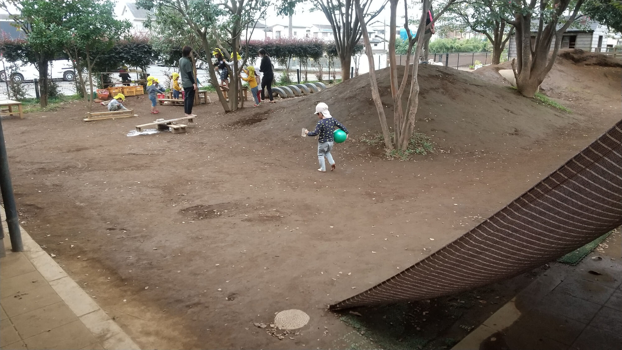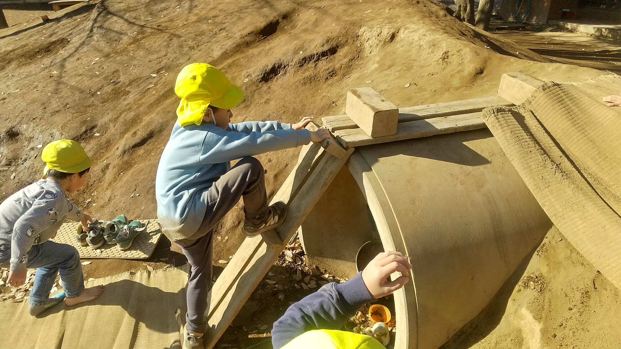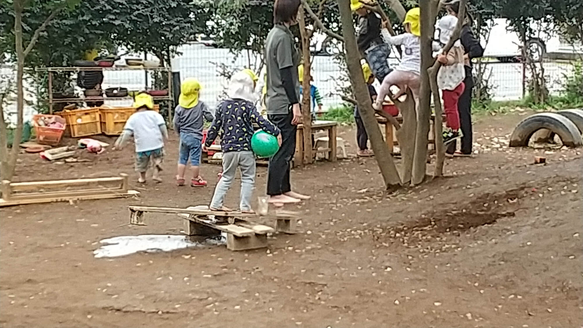 ベンチを土管に立てかけはしごのように使ったり、並べて長くすることで電車に見立てたり。子どもたちは大人が想像する以上に一つの物を使って遊びを発展させる力をもっています。