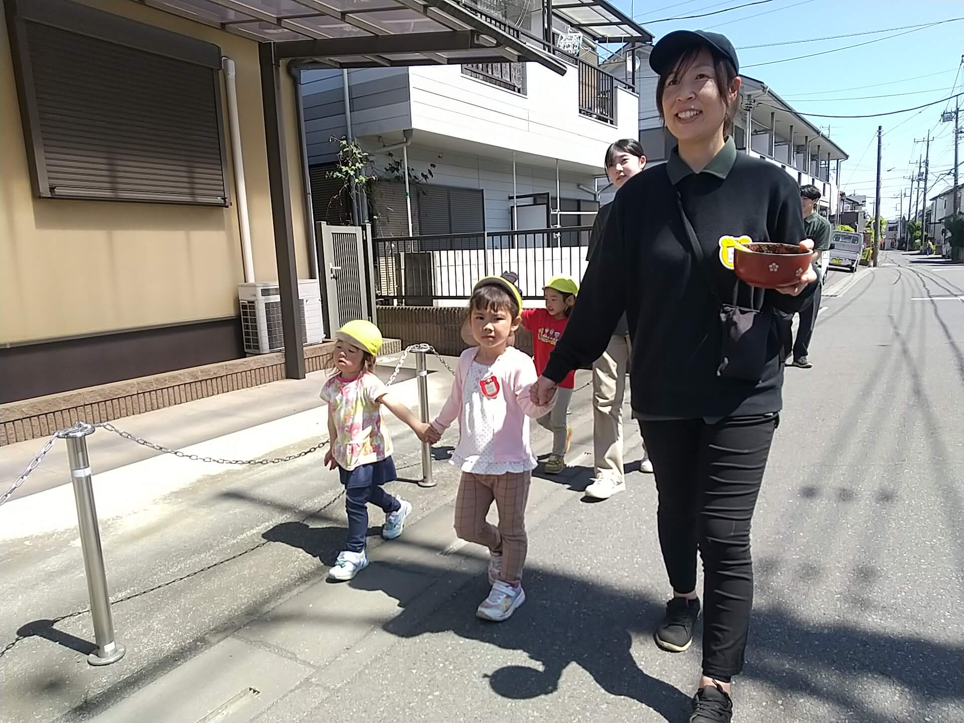 散歩も、日々経験していく活動の一つです。大人が手を繋ぐ相手を決めてしまうのではなく、子ども自身が繋ぎたい友だちの所へ行き誘ってみたり、誘われて受け入れたりと子ども同士がやりとりする経験を大切にしています。