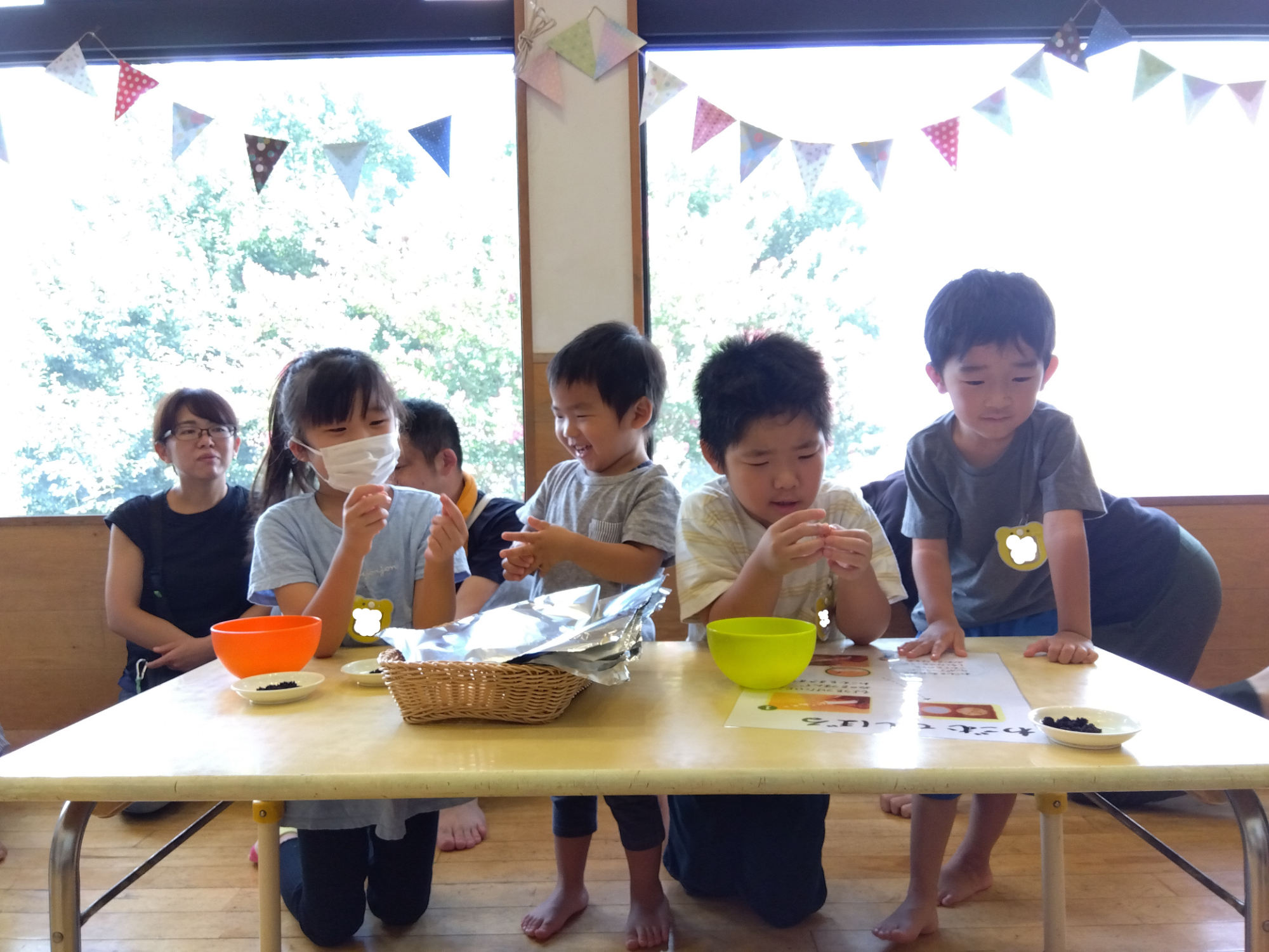 普段から身近にある玉ねぎの皮や、カフェで見かけるコーヒーから出てくるかす、園庭にある桜の葉が、それぞれ異なった色合いや風味を出し、世界に一つだけの巾着袋を作ることができました。