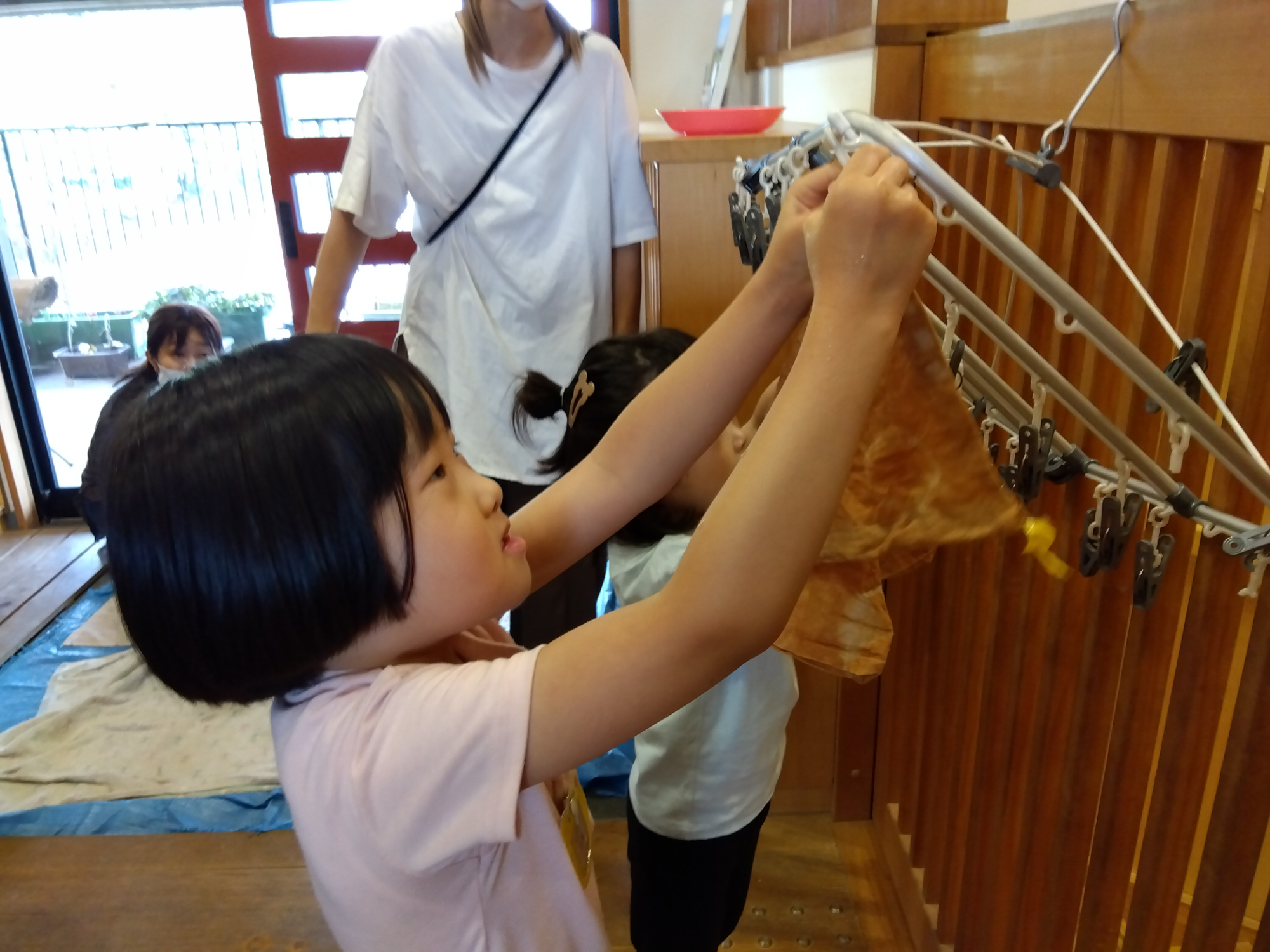 染まった巾着袋は、みんなで洗濯をするように水洗いをしました。乾いた後にどんな色になるのか、真剣な面持ちで巾着袋を干す姿がみられました。