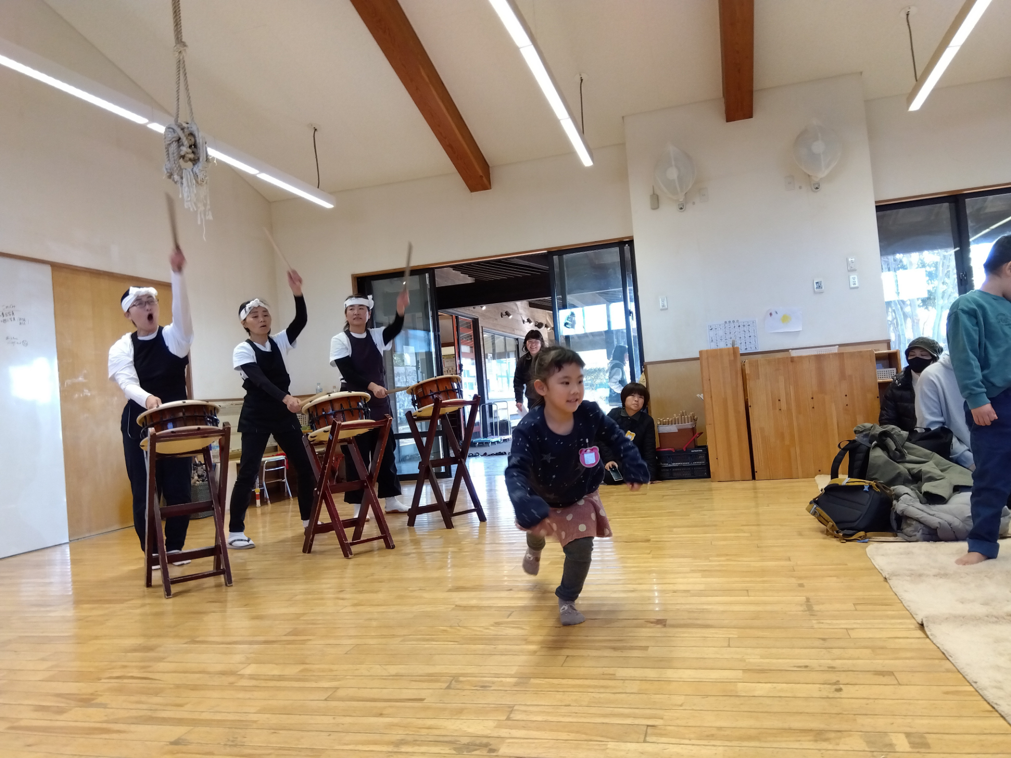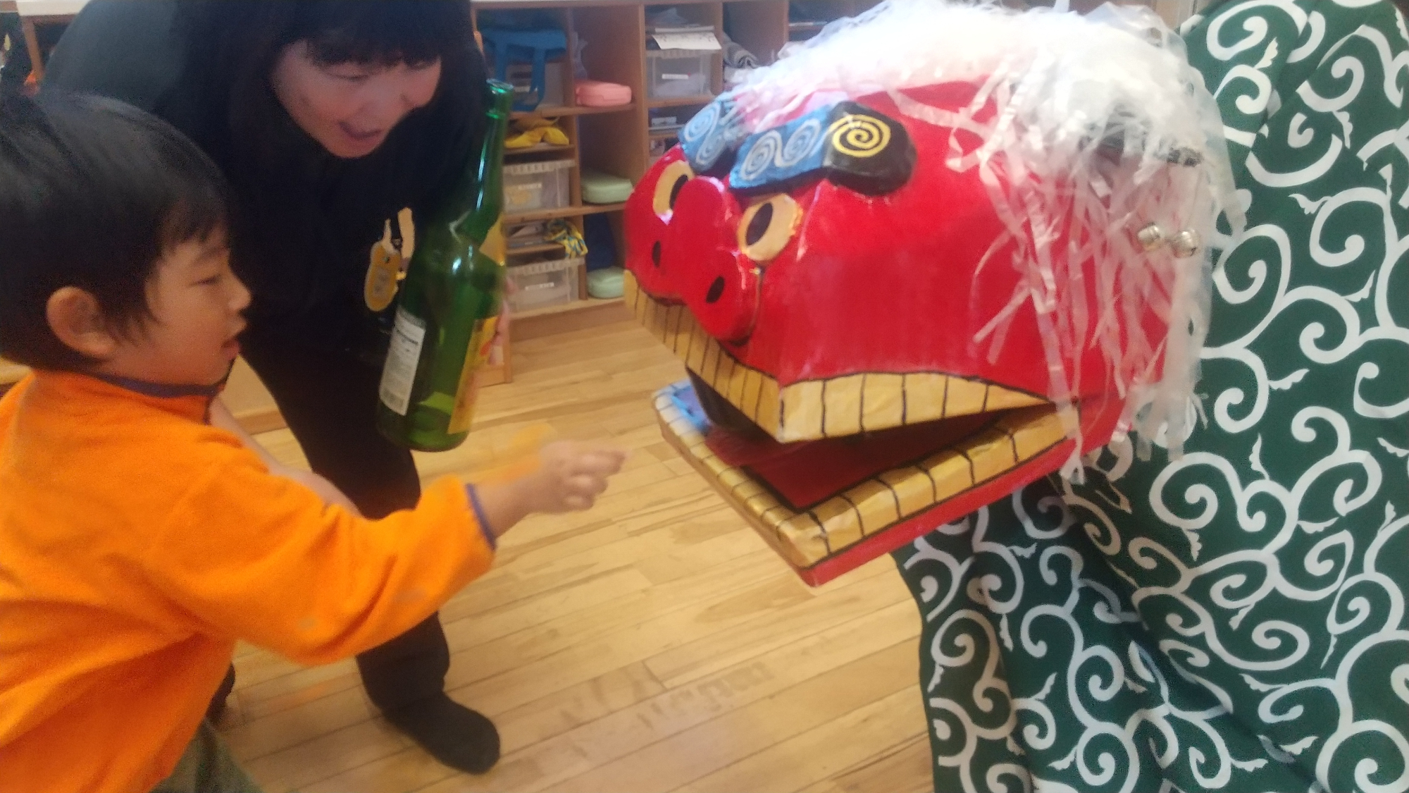 獅子舞の演目では、子どもたちは獅子が舞う姿に目を丸くし、顔が「怖い」と言いながらも厄払いのため大きな口に噛まれていました。また、お正月の祝い酒を緊張しながらも飲ませ、酔っぱらって寝てしまった獅子に、「触りたい!」と自ら触り始める子どももたくさん居ました。集団の中で過ごすことが苦手な子どもたちも、この日は和太鼓や獅子舞に興味を持ち、自然と楽しみながら大きな集団で過ごしていました。