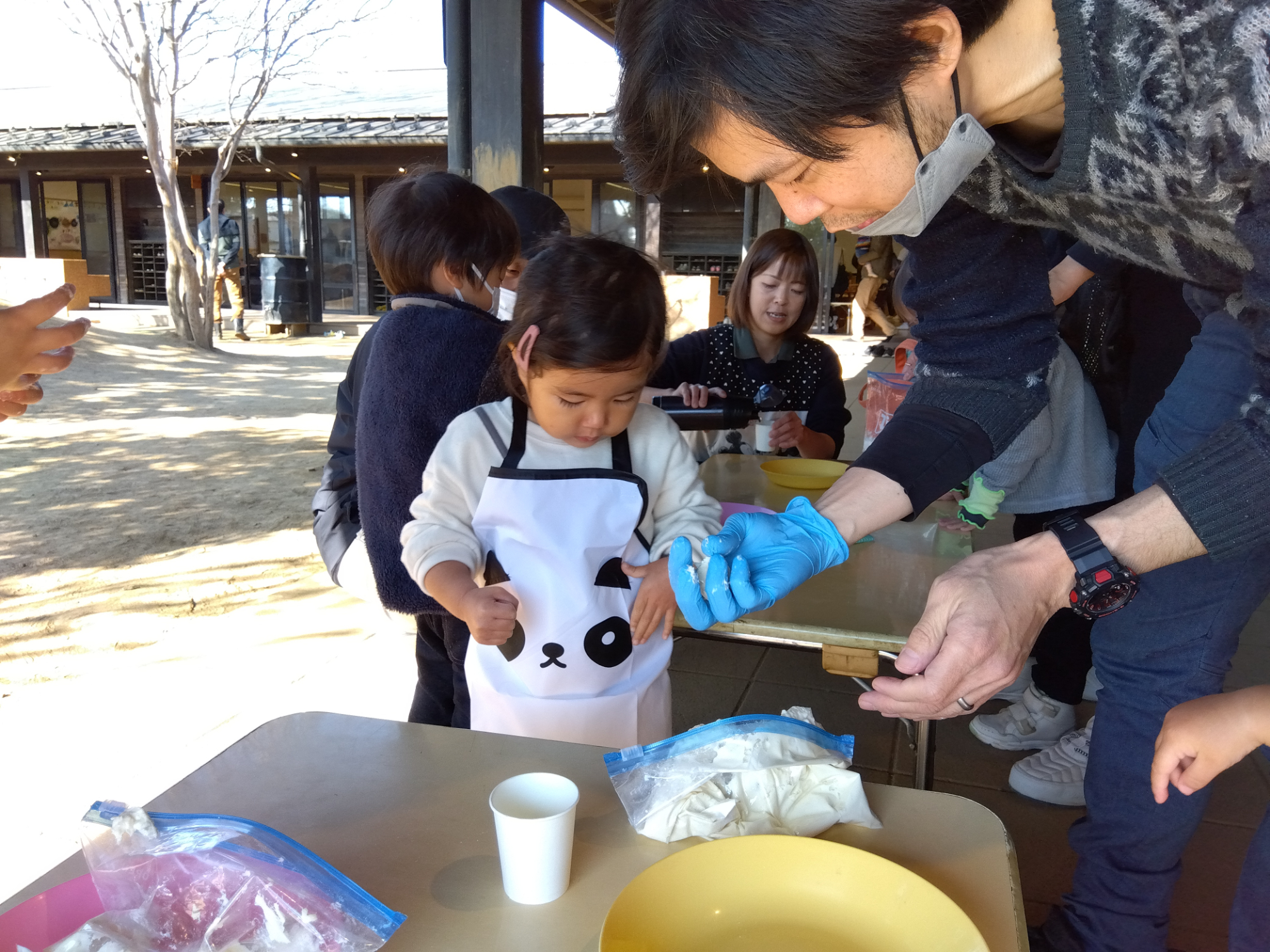 演目後は凧作り、めんこ作り、カルタ、書初め、福笑いの体験活動と調理活動、太鼓体験に分かれました。体験活動のお正月遊びでは、家族みんなで一緒に作り、遊べるように準備しました。調理活動や太鼓体験も平行して行ったため、室内でゆっくり、家族と安心して遊んでいる姿が多く見られました。調理活動ではビジターグループで育てた冬野菜と手作り味噌を使い、かまどを使用してすいとん作りを行いました。保存袋に小麦粉と水を入れて作ることで、汚れることを気にする子や年齢が低い子まで、多くの子が楽しんで取り組む姿が見られました。そして、最後は家族や友達と一緒に食べたことで、普段は野菜を食べられない子も「美味しい」と言って食べていました。自分たちの手で作った野菜やすいとんだったこともありますが、家族や友達と一緒に食べるといった、一緒に食べる人や環境も食事にとってはとても大切なことで、食育にも繋がる経験となりました。