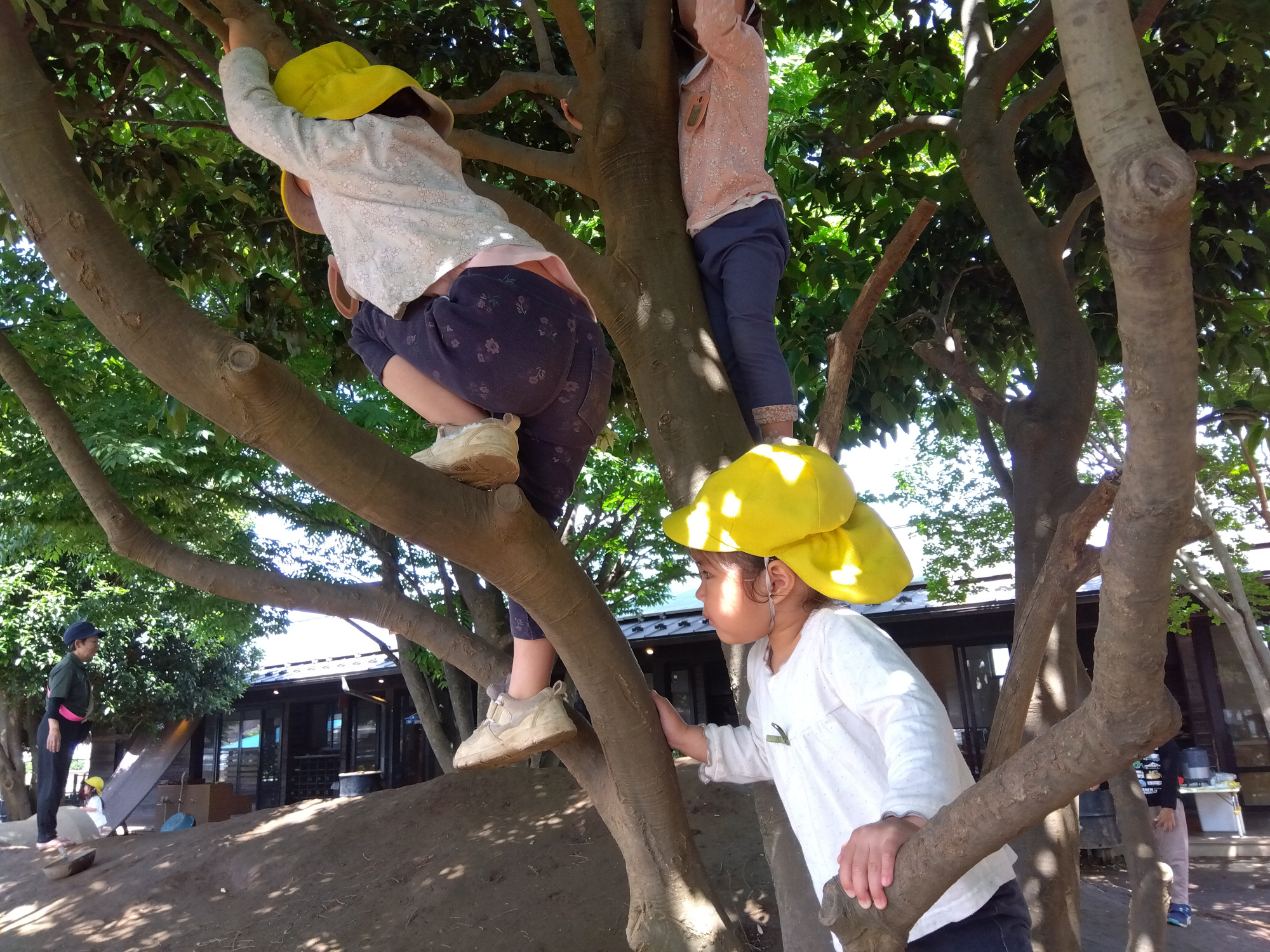 園庭には木登りしやすいように整えられた木が植えてあります。お兄さんたちが高い所まで登る姿を憧れのまなざしで見ている小さいクラスの子どもたちが、「先生、手伝って。乗せて」と言うことがあります。ですが、スタッフは抱っこして木に乗せることはしません。自分の感覚、自分の力で登れるようになるのを見守ります。