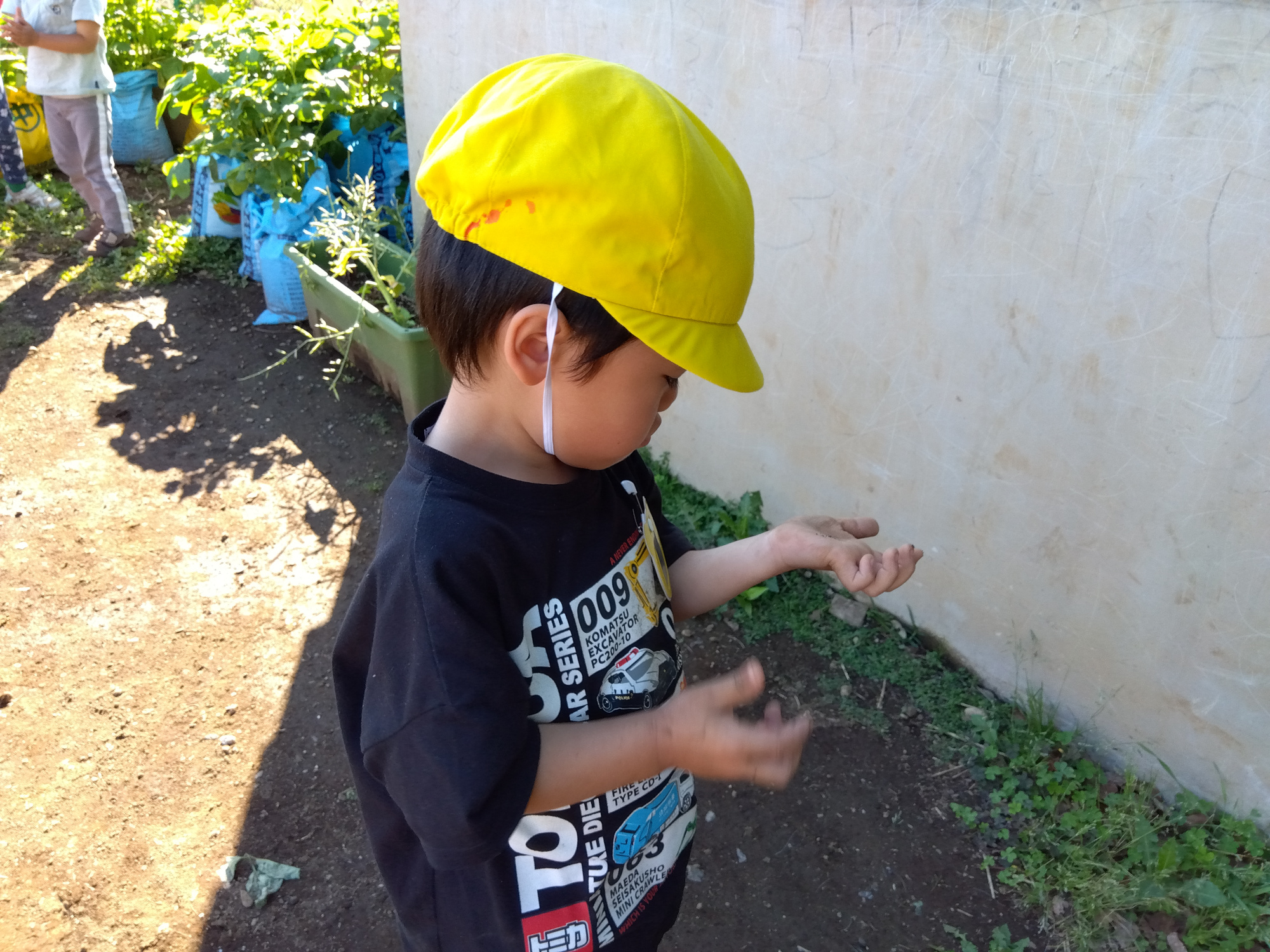 こちらはダンゴムシを見つけ、大切そうに手の平にのせている様子です。小さくてころころと転がるダンゴムシをつぶさないようそっとつまむことで、力の調節や集中力、目と手の協応動作などが養われます。また、自分でみつけた喜びは物事をやり遂げる力や興味関心の広がりにもつながっていきます。この日はダンゴムシを大切にとっておき、嬉しそうにお母さまに見せていました。