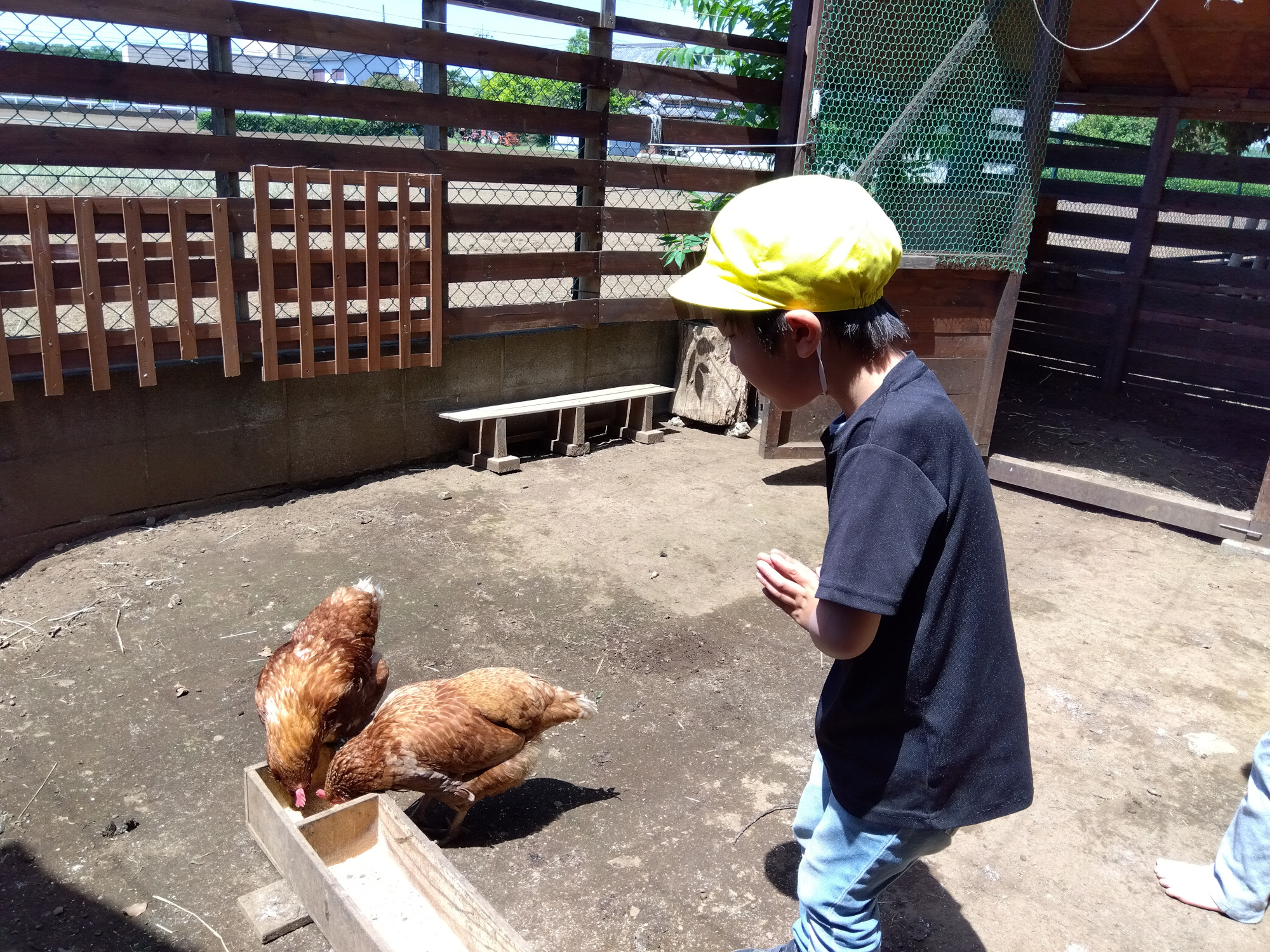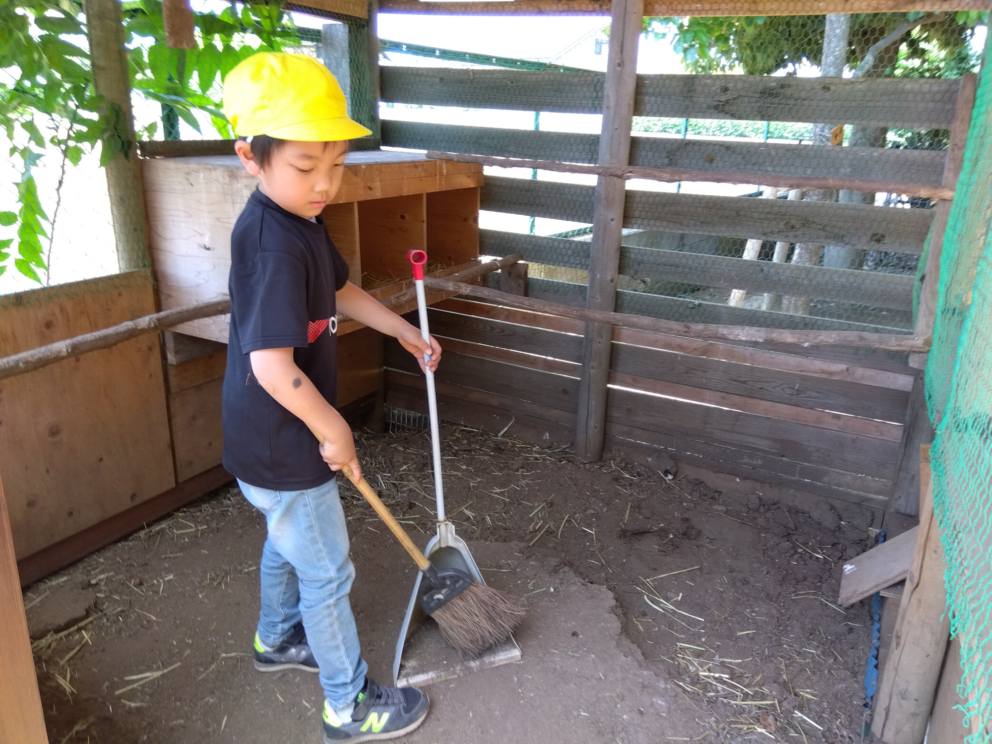 食べることが大好きなこのお子さまは、この日も何か作って食べようと考えたのか、自分から積極的に鶏小屋に入り卵を探していました。卵がないとわかると、どうしたらいいか自分で考え小屋の掃除を始めました。隅々まで掃除を終えると、「ぴかぴかにしたよ。たまごを産んで。お願い」と鶏にお願いしていました。自分で考えて行動する力や、相手の気持ちを想像する力が育っているなと微笑ましく感じました。