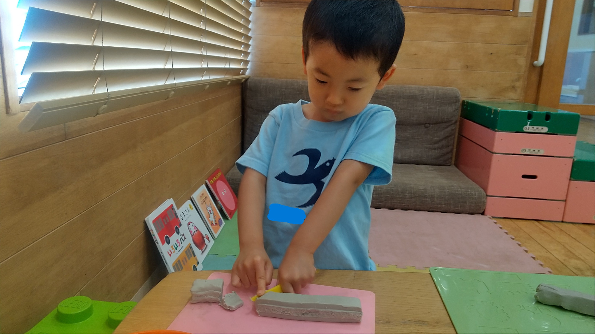 去年度まではご家族と一緒に調理活動を行っていた〇曜日キッズグループでしたが、子どもたちの成長から今年度からは子どもたちだけで行うクッキー作りを計画しました。しかし、粘土や泥などの感触を苦手にするお子さまや道具を使うことが苦手なお子さまもいました。そのため、油粘土や小麦粉粘土などの感触に触れ、道具を使う練習を遊びから経験できるように、日々の支援に設定し継続的に行いました。継続的に行うことで、上の写真の様に自ら楽しみながら粘土を触って、道具を使い遊ぶ姿が見られてきました。