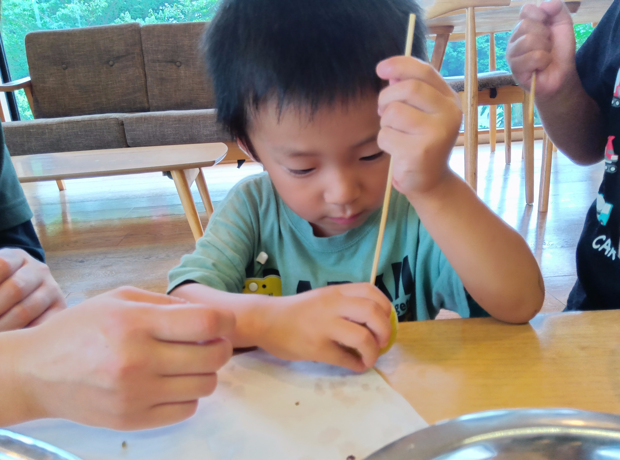 また、感触遊びだけでは梅仕事も行いました。竹串を使って梅のヘタを取り、梅の実に何度も刺して穴をあけました。食べることが好きなこともあり、しっかり手元を見て、竹串を使って梅仕事に取り組むことができました。梅の色や柔らかさ、匂いにも触れ、言葉で伝え合う姿も見られました。