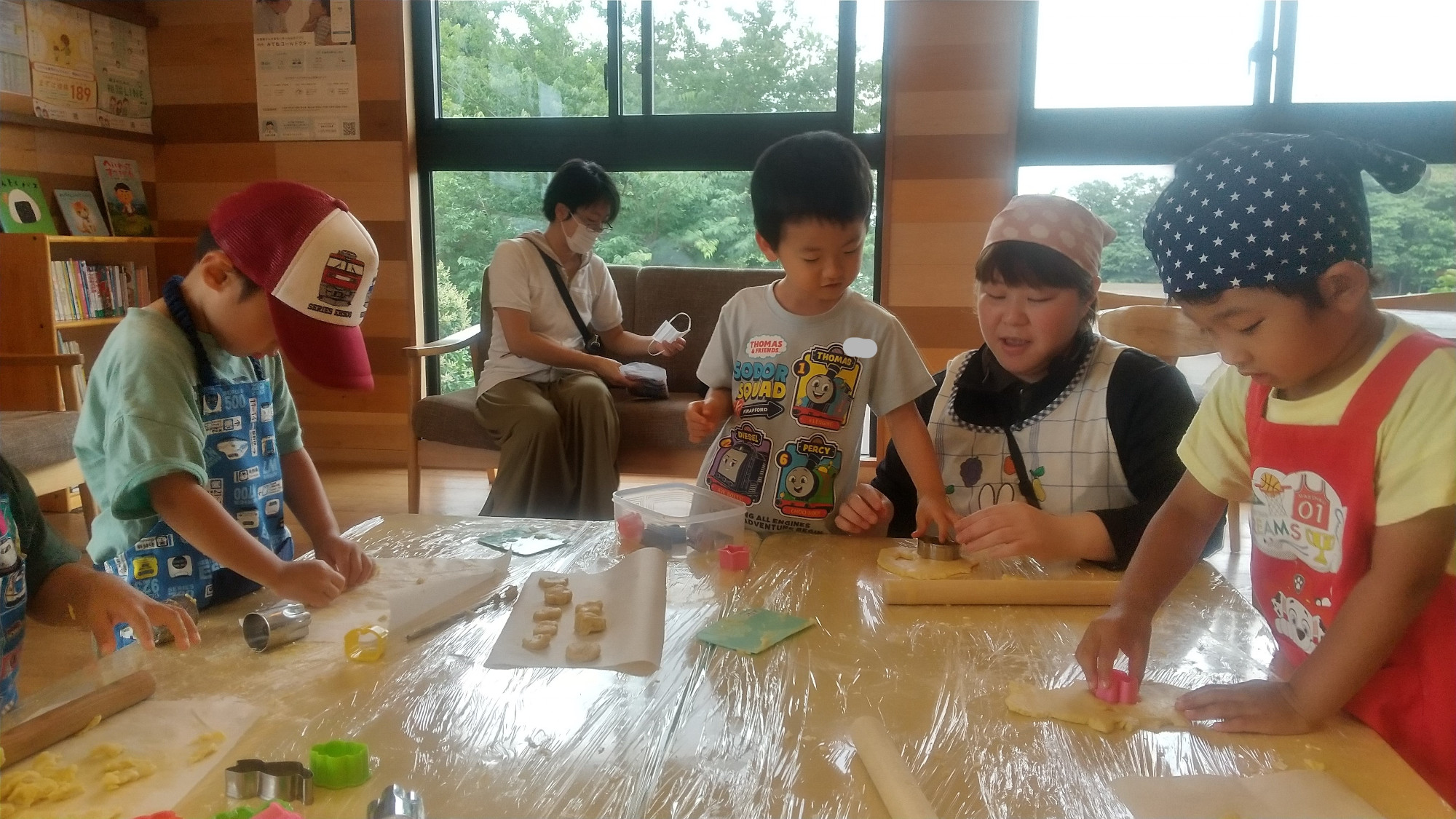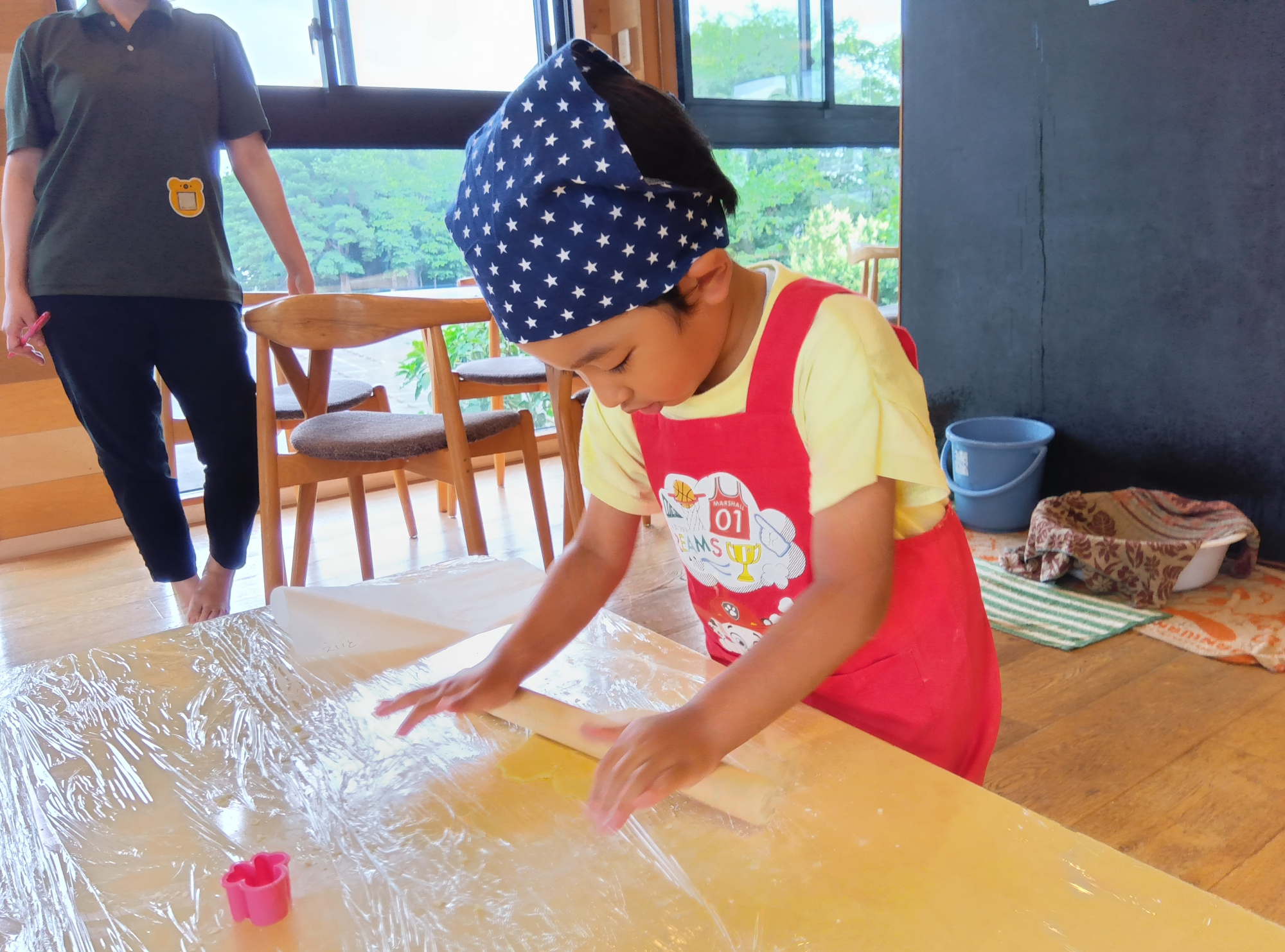 そして、本番のクッキー作りでは粉の計量から、生地作り、型抜きまで子どもたちだけで行うことができました。上手に麺棒を使って生地を伸ばしています。上手に薄く伸ばせたことで、型抜きもきれいにでき、笑顔で「できたよ!」と教えてくれました。感触遊びを継続的に行ってきたからこその、達成感に繋がった瞬間でした。