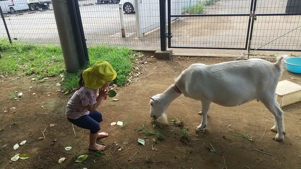 これは、ヤギのキナコに餌をあげたいけれど、怖くて近づけないTちゃん。