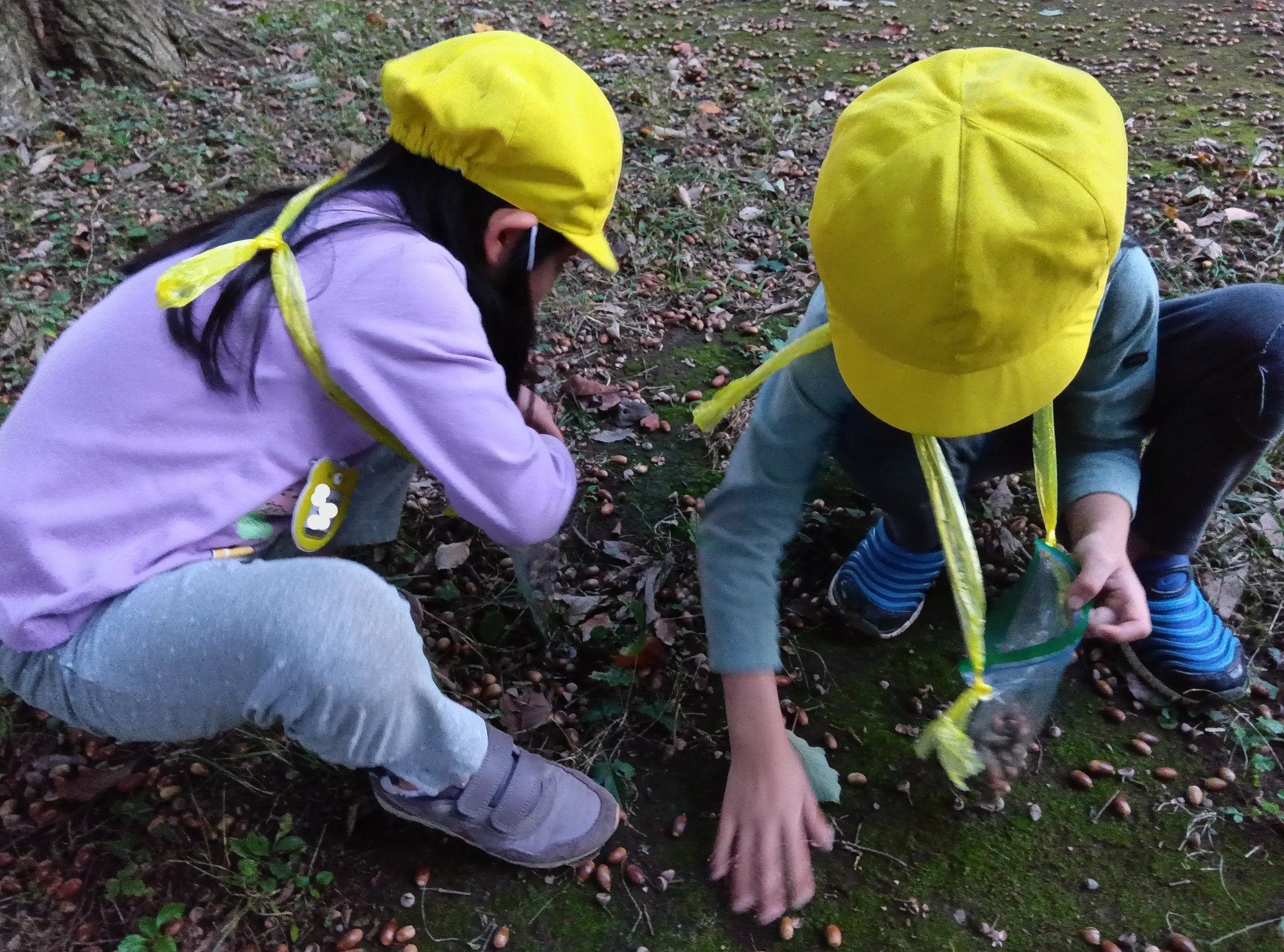 遊具だけでなく、季節を感じる植物や、木の実、生き物との出会いも魅力です。この日の公園にはこの季節どんぐりや葉がたくさん落ちていたので、みんな夢中で拾って集めていました。拾ったどんぐりをみんなで広げて、大きさや数を比べたり、きれいなものと割れているものを分けてみたり、自然から学ぶことも沢山あります。
