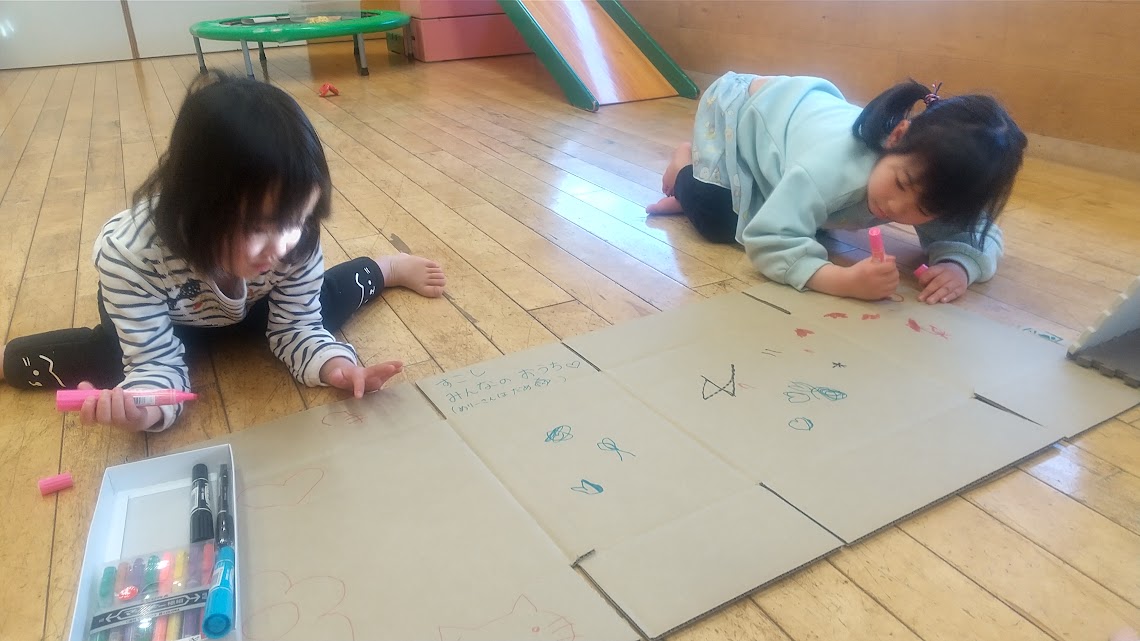 Sちゃんが絵を描き出すとCちゃんも興味を持って絵を描き始めました。段ボール動かさないでと怒ったり怒られたりする場面もありながら一つの段ボールを共有しています。