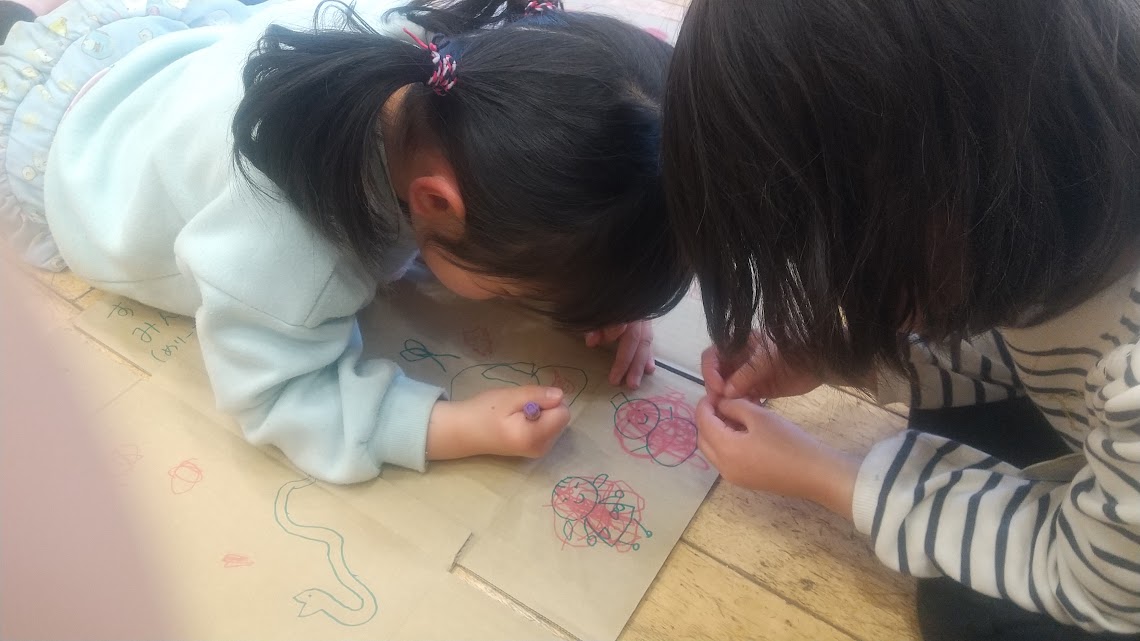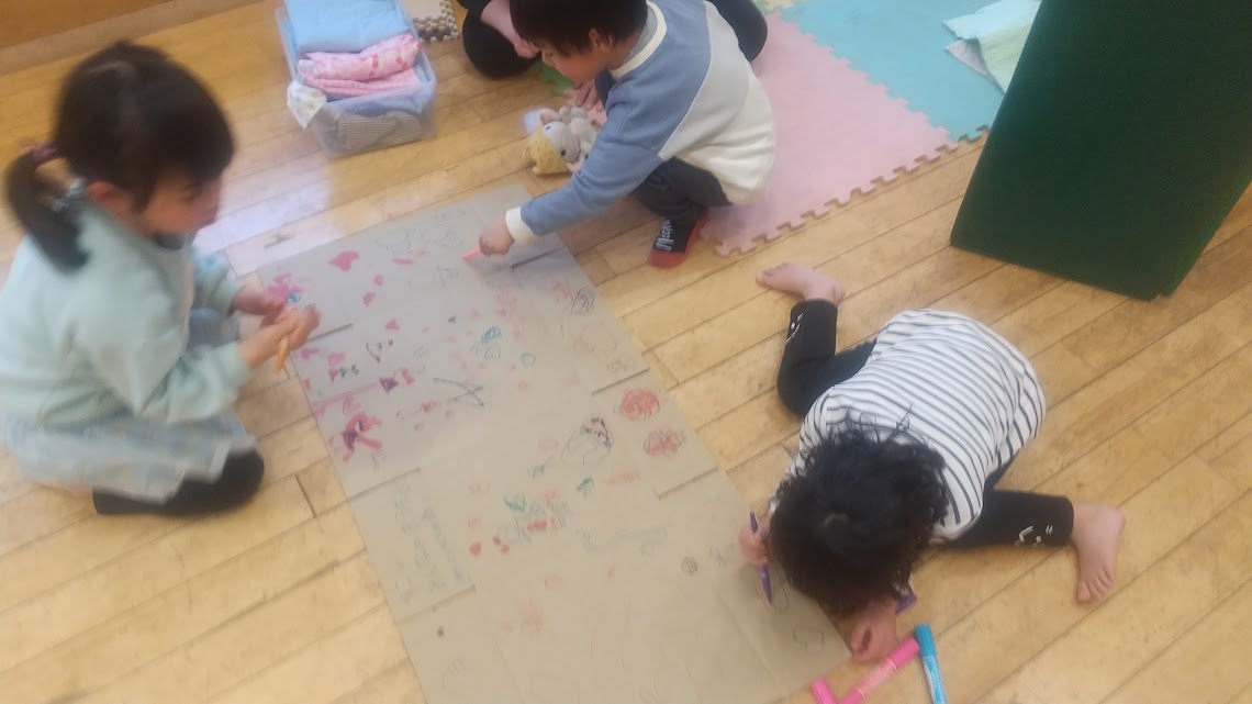 同じグループの仲間であるHくんはお家の中に入って寝室作り。自分のペースでお家作り遊びに参加し楽しんでいました。様子をみながらスタッフからもお絵描きに誘うとHくんも自分のタイミングでお絵描きに加わります。