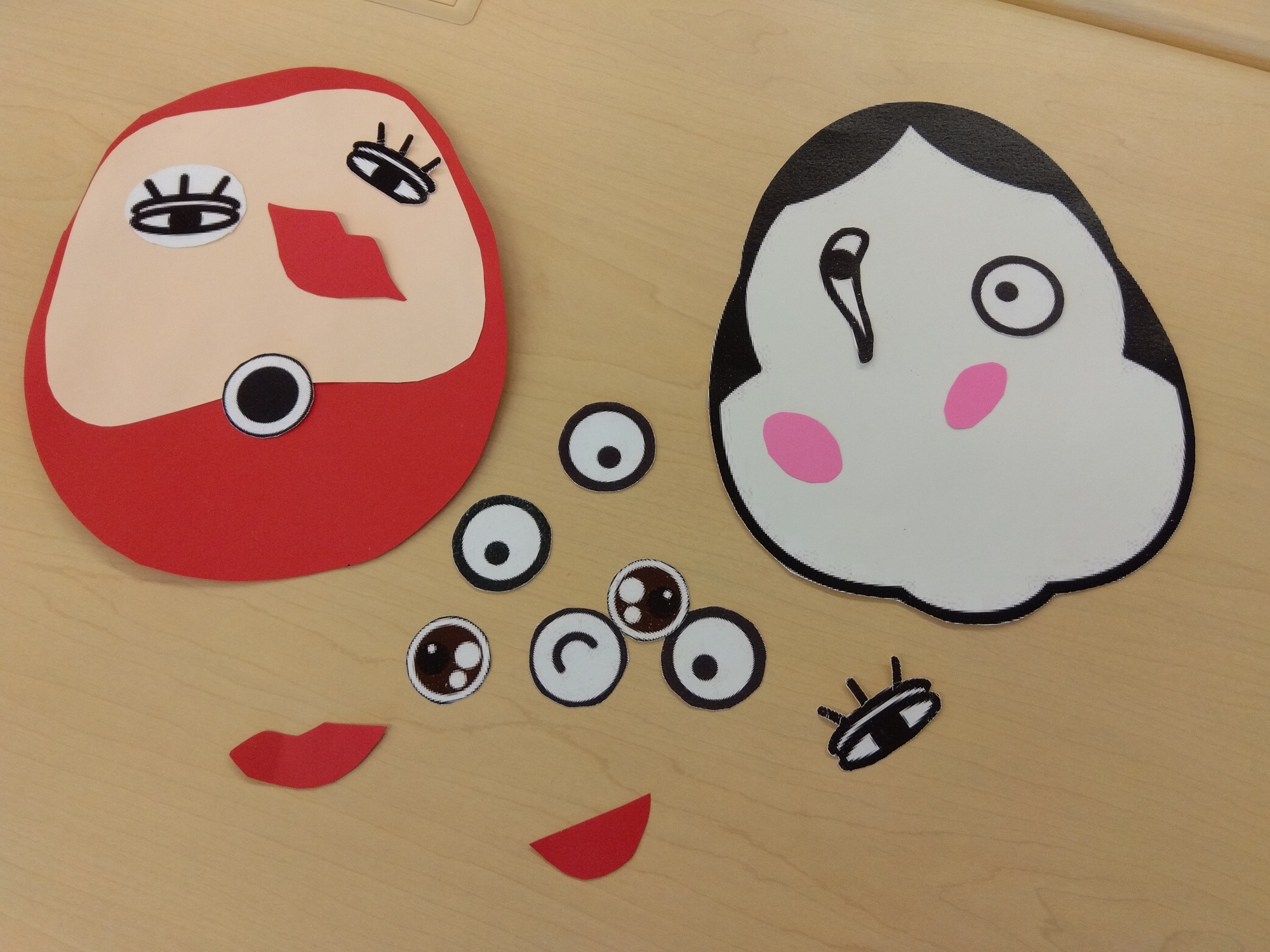 今回、目隠しはせず、自分で目を閉じてもらい「だるま」や「おかめ」などの顔をつくります。子どもの発達状態に合わせて様々な大きさの顔を用意しました。真剣に目を閉じている子やしっかり目を開けて顔を作っている子もおり、作った顔を見て大笑いしたり「変な顔」と落ち込む子もいたり、完成した様々な顔に作り手の受け止め方も様々でした。
