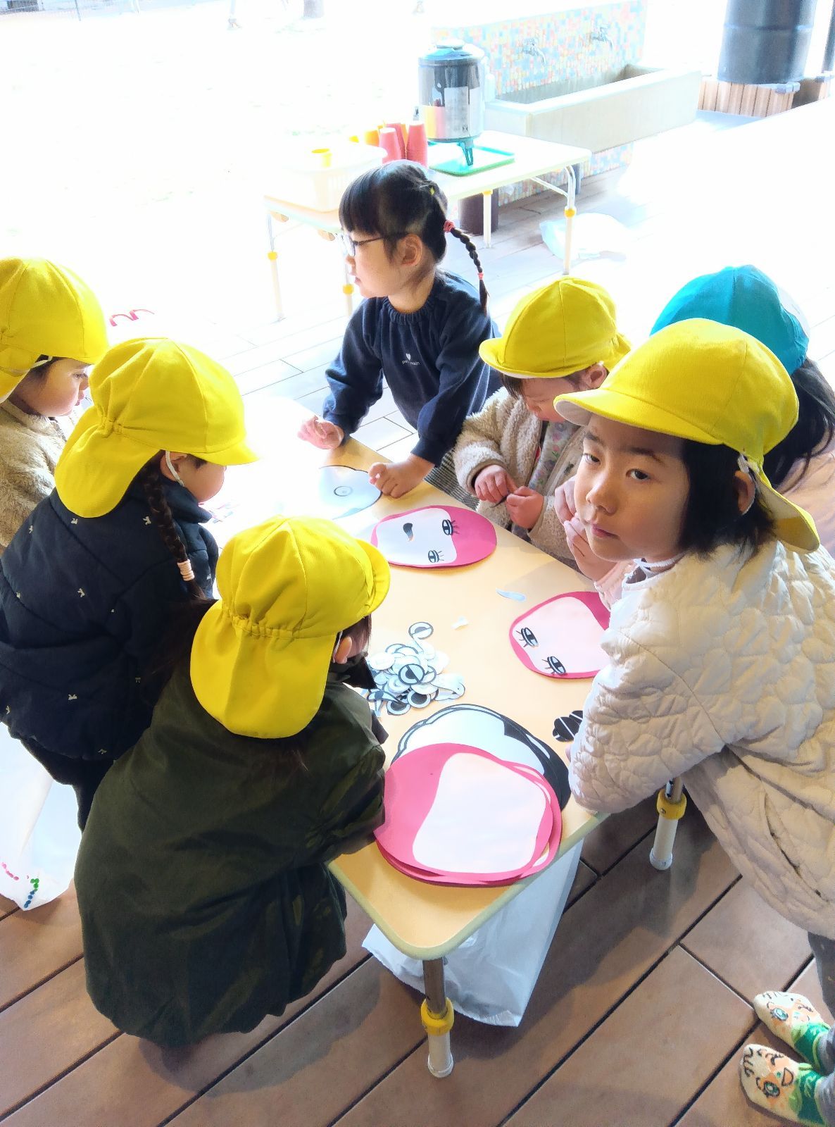 今回は伝承遊びの「福笑い」の様子をお届けします。「福笑い」は、昔から正月遊びとして知られています。目隠しをして、顔型に目や鼻などの顔のパーツを置いていく遊びです。出来上がった顔の面白さから思わず笑顔になってしまうため新年の幸せを願って遊ぶようになったと言われています。まさに「笑う門には福来る」です。
