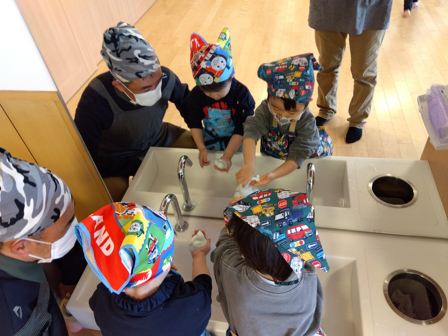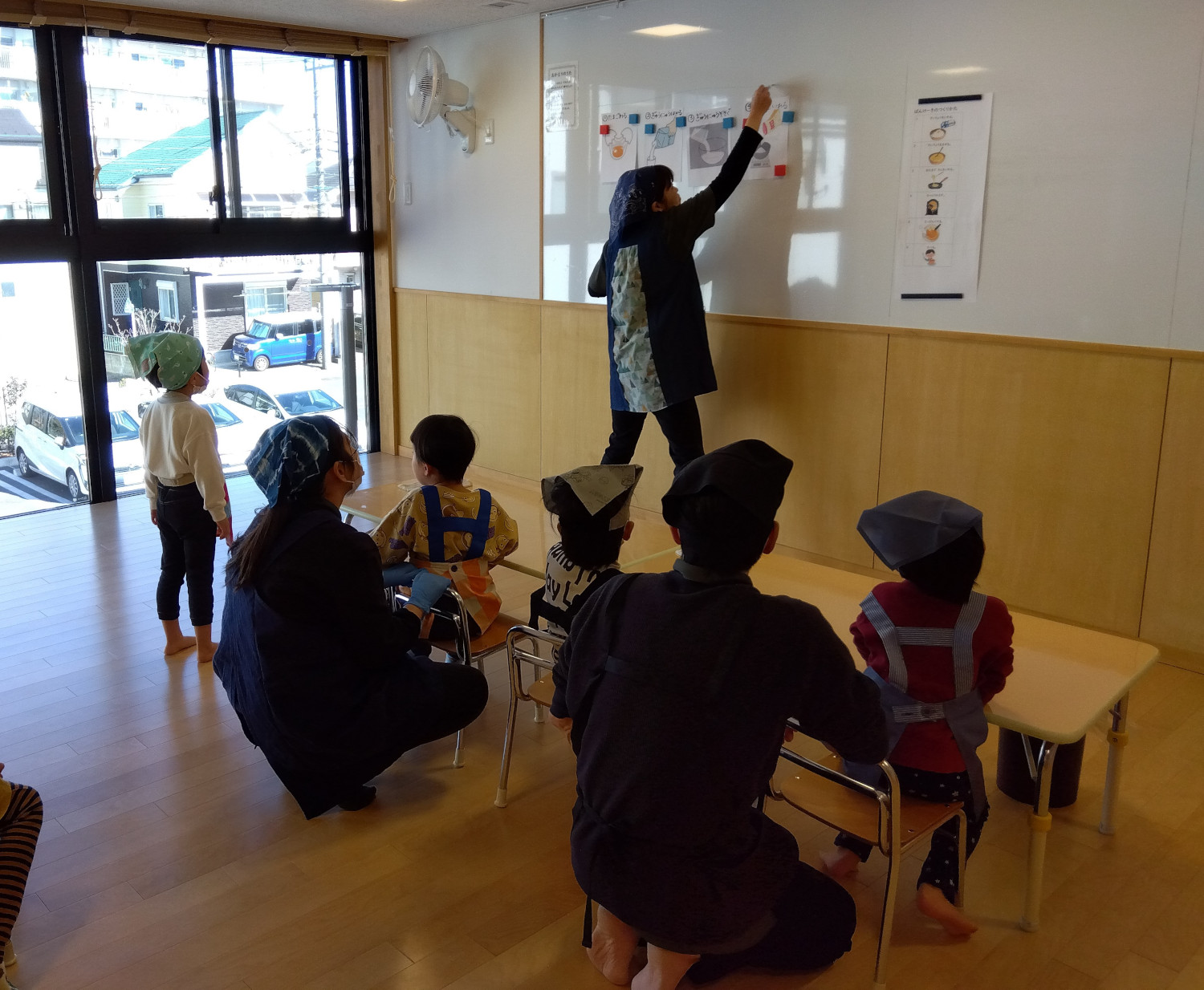 今回のメニューは、ホットケーキ。まず「でこぼこホットケーキ」の絵本の読み聞かせをしました。本の後に説明を聞くと、やる気満々、準備万端の子どもたちです。