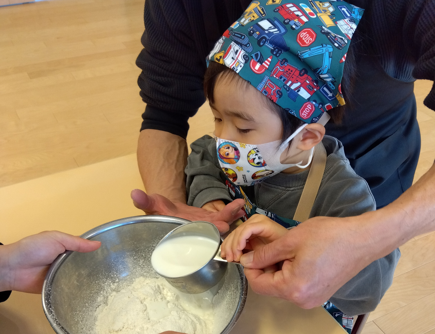 まず、粉をボウルにそっと入れ、次に牛乳を入れました。牛乳を入れる時はこぼさない様に、慎重に入れている姿が印象的でした。牛乳を入れたら、泡だて器を使ってみんなで順番に混ぜていきました。沢山混ぜた後はその生地を、ホットプレートにお玉で流してきます。