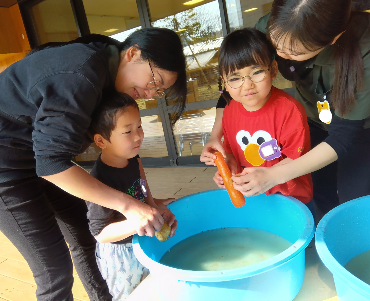 日課である米とぎと玉ねぎの皮むきをしました。にんじんとじゃがいもは、スポンジを使って洗いました。これらの作業は、指先を使うため、手先の器用さを促していくことができます。