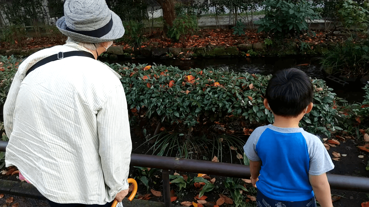 これは、個別の支援で目黒川緑道を散歩していた時の一場面です。歩いている途中、道の下から水の音がしていることに気づいたN君。職員に「なんで水の音がするの?」と質問をしました。すると、たまたま通りかかった地域の方が「ここには下水が通っているのよ」と教えてくれました。少し移動して、今度は一緒に鯉を見ることに。徐々にその地域の方とも慣れてきて、会話が どんどん弾んできました。色々な経験をされているので何でも優しく答えてくださり、N君も「なんで?なんで?」と興味を持ち、一生懸命話を聞いていました。