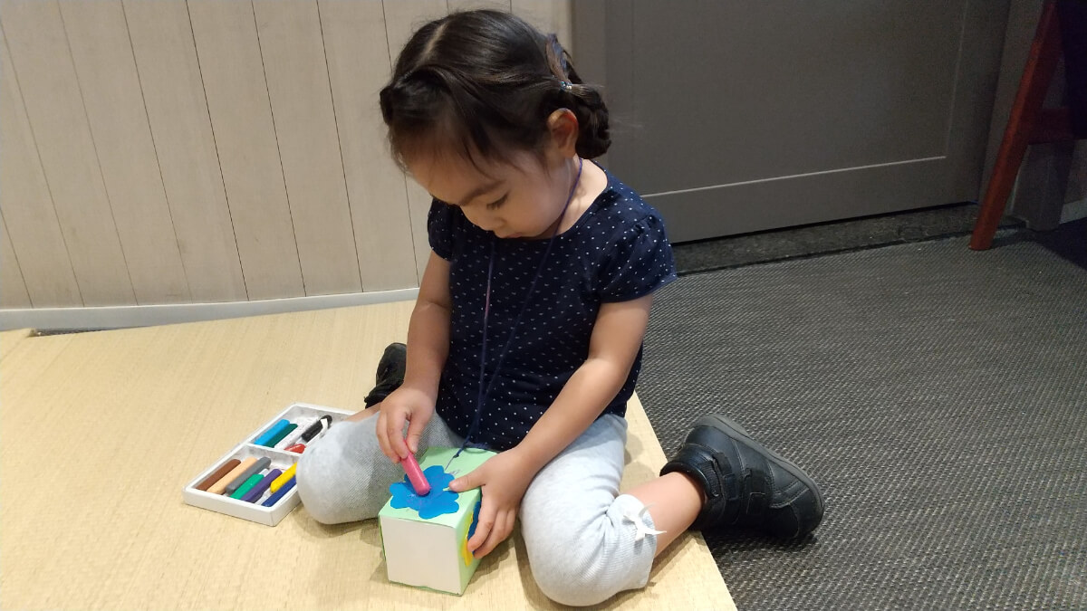 緑道にいる鯉にエサをあげることがお気に入りのMちゃん。ただ餌をあげにいくだけではなく、今回はエサを入れる箱を作ることにしました。制作活動があまり好きではなく、いつもは「やらない」と首を横に振ることが多いMちゃんですが、今回は「餌をあげたい」という気持ちから、積極的に制作を行っていました。